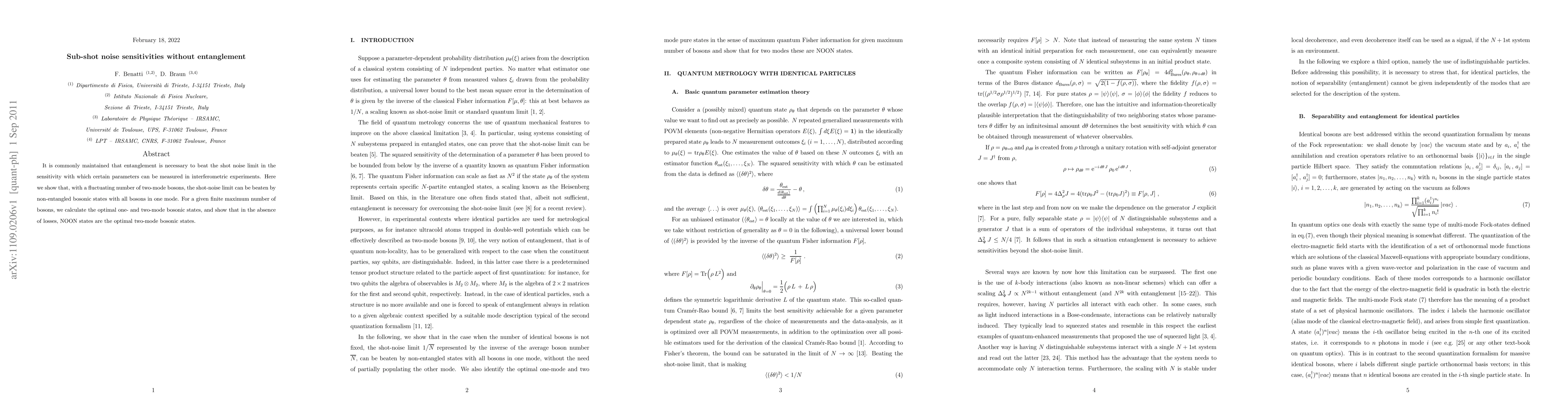 This paper demonstrates that non-entangled bosonic states, specifically with all bosons in one mode, can surpass the shot noise limit in interferometric measurements, challenging the necessity of entanglement for achieving such sensitivities. The study identifies optimal one- and two-mode bosonic states, revealing NOON states as the best for two-mode configurations without losses.