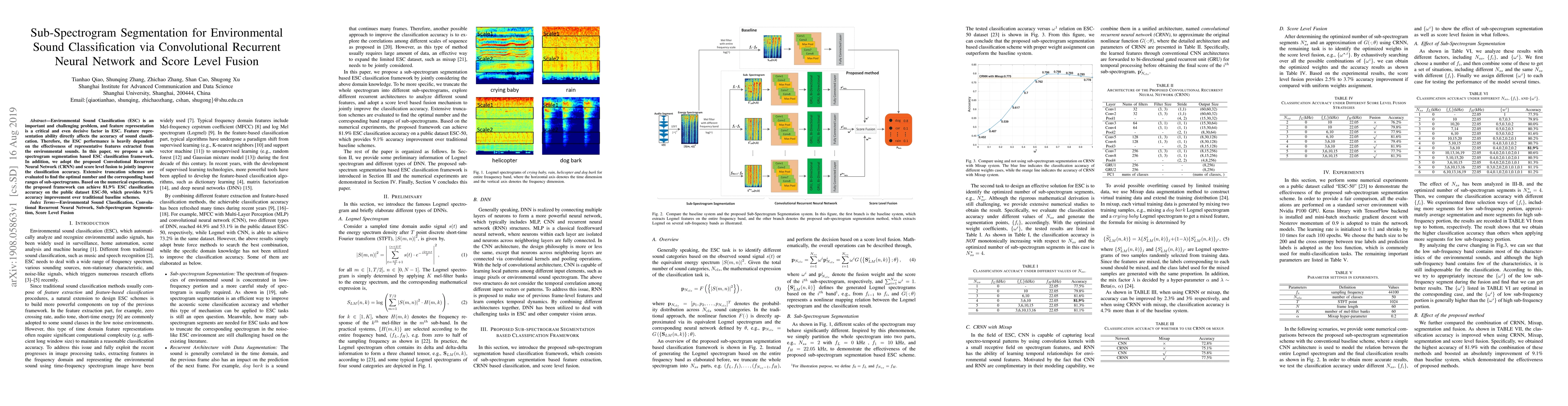 This paper proposes a sub-spectrogram segmentation framework for Environmental Sound Classification (ESC) using a Convolutional Recurrent Neural Network (CRNN) and score level fusion, achieving an 81.9% classification accuracy on the ESC-50 dataset, outperforming traditional baselines by 9.1%.