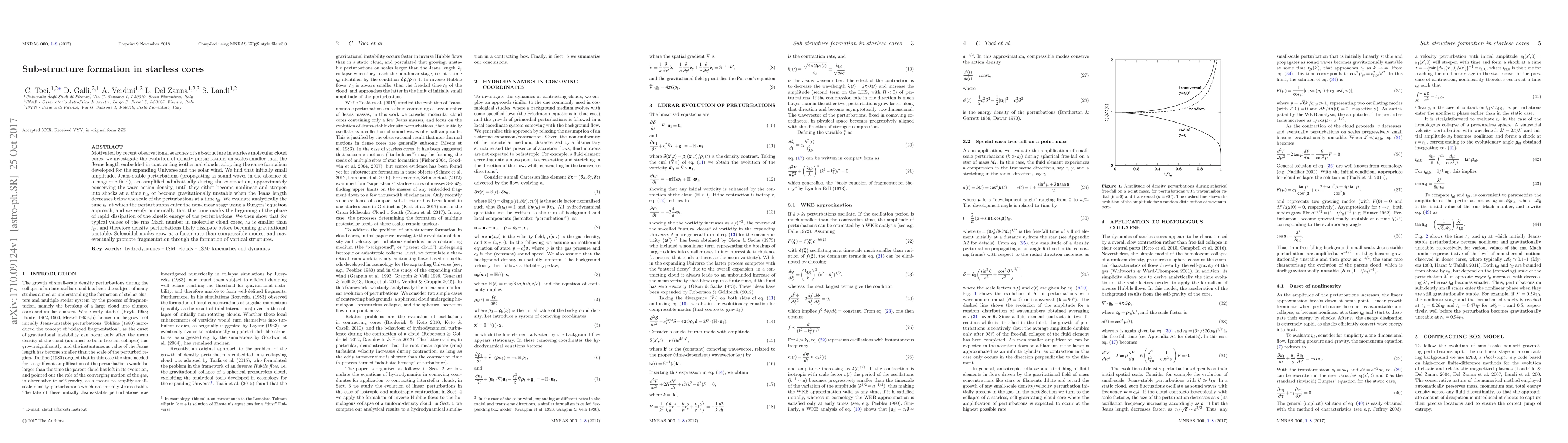 This study explores the evolution of density fluctuations within collapsing, starless molecular cloud cores. Utilizing formalism from the expanding Universe and solar wind, it finds that small, stable perturbations amplify during contraction, potentially leading to nonlinear shocks or gravitational instability. Analytical and numerical methods reveal that non-linear stages typically occur before gravitational instability, with solenoidal modes growing faster and possibly causing fragmentation via vortical structures.