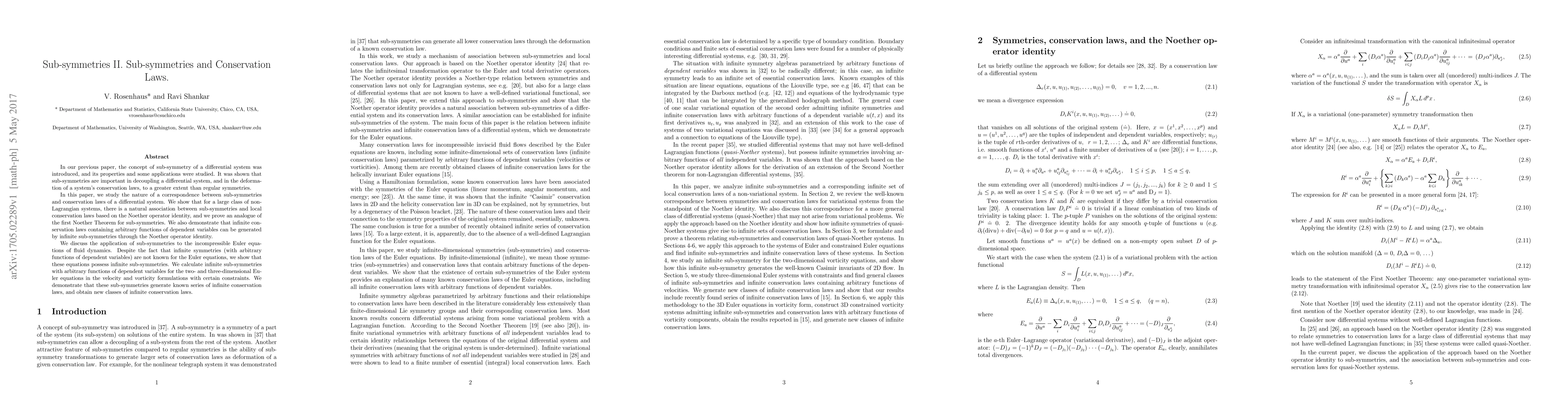This paper extends the concept of sub-symmetries to explore their correspondence with conservation laws in differential systems, proving an analogue of the first Noether Theorem for sub-symmetries and demonstrating infinite sub-symmetries' ability to generate infinite conservation laws. It applies these findings to the incompressible Euler equations, revealing their infinite sub-symmetries despite the absence of infinite symmetries.
