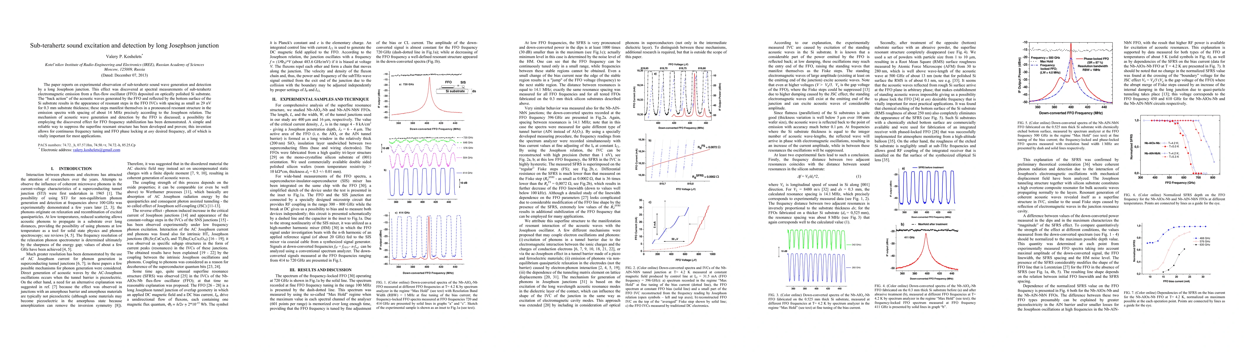 The paper details experimental observation of sub-terahertz sound wave generation and detection via a long Josephson junction, revealing resonant steps in flux-flow oscillator IVCs and demonstrating potential for frequency stabilization and continuous tuning. A method for suppressing superfine resonant structures is also introduced, facilitating phase locking.