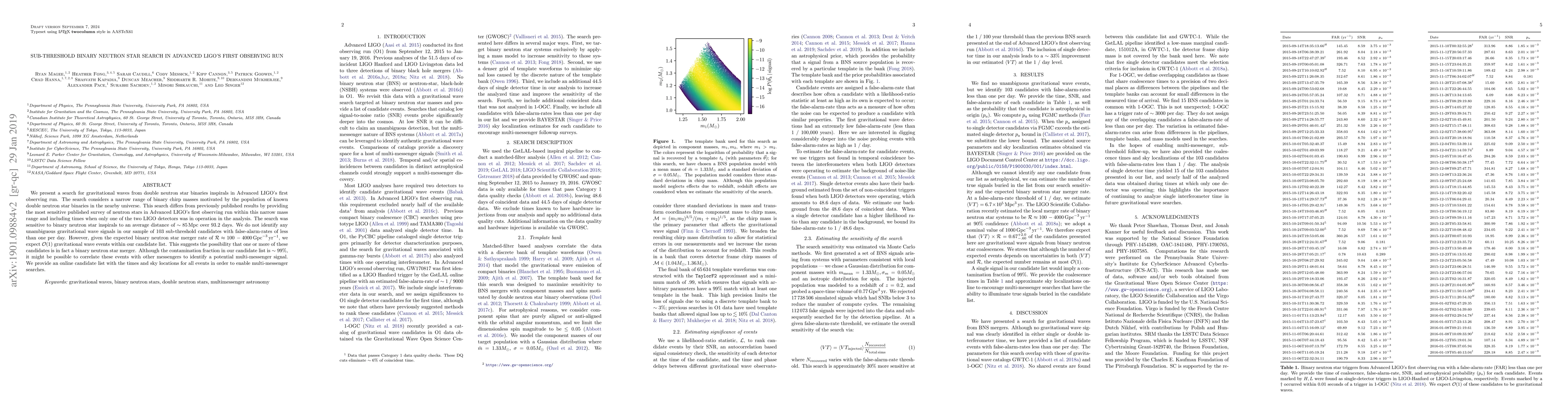 We present a search for gravitational waves from double neutron star binaries inspirals in Advanced LIGO's first observing run. The search considers a narrow range of binary chirp masses motivated by the population of known double neutron star binaries in the nearby universe. This search differs from previously published results by providing the most sensitive published survey of neutron stars in Advanced LIGO's first observing run within this narrow mass range and including times when only one of the two LIGO detectors was in operation in the analysis. The search was sensitive to binary neutron star inspirals to an average distance of ~85 Mpc over 93.2 days. We do not identify any unambiguous gravitational wave signals in our sample of 103 sub-threshold candidates with false-alarm-rates of less than one per day. However, given the expected binary neutron star merger rate of R = 100 - 4000 Gpc^(-3) yr^(-1), we expect O(1) gravitational wave events within our candidate list. This suggests the possibility that one or more of these candidates is in fact a binary neutron star merger. Although the contamination fraction in our candidate list is ~99%, it might be possible to correlate these events with other messengers to identify a potential multi-messenger signal. We provide an online candidate list with the times and sky locations for all events in order to enable multi-messenger searches.