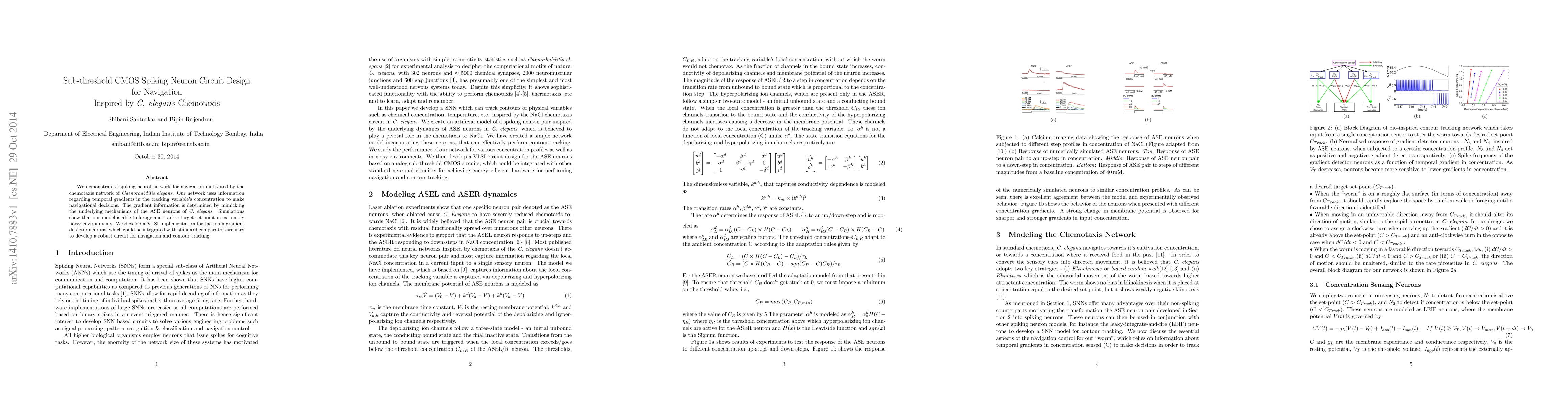 We demonstrate a spiking neural network for navigation motivated by the chemotaxis network of Caenorhabditis elegans. Our network uses information regarding temporal gradients in the tracking variable's concentration to make navigational decisions. The gradient information is determined by mimicking the underlying mechanisms of the ASE neurons of C. elegans. Simulations show that our model is able to forage and track a target set-point in extremely noisy environments. We develop a VLSI implementation for the main gradient detector neurons, which could be integrated with standard comparator circuitry to develop a robust circuit for navigation and contour tracking.