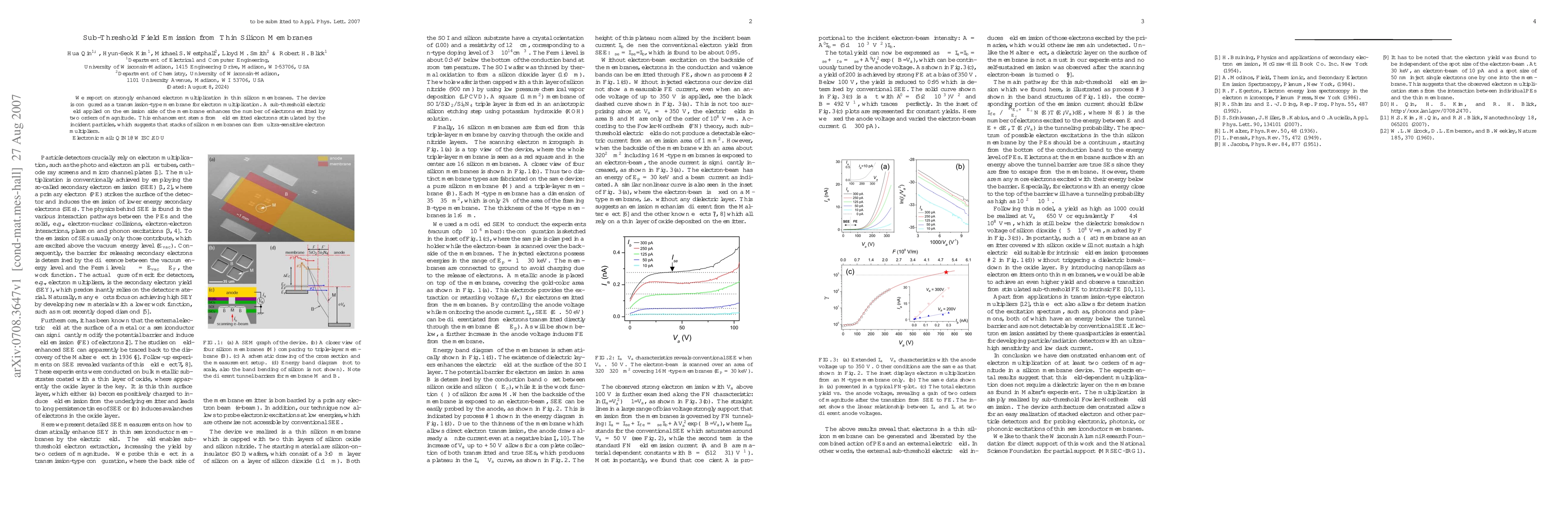 This study demonstrates significantly increased electron multiplication in thin silicon membranes under sub-threshold electric fields, achieving a two-order-of-magnitude enhancement due to field-emitted electrons stimulated by incident particles, indicating potential for ultra-sensitive electron multipliers.
