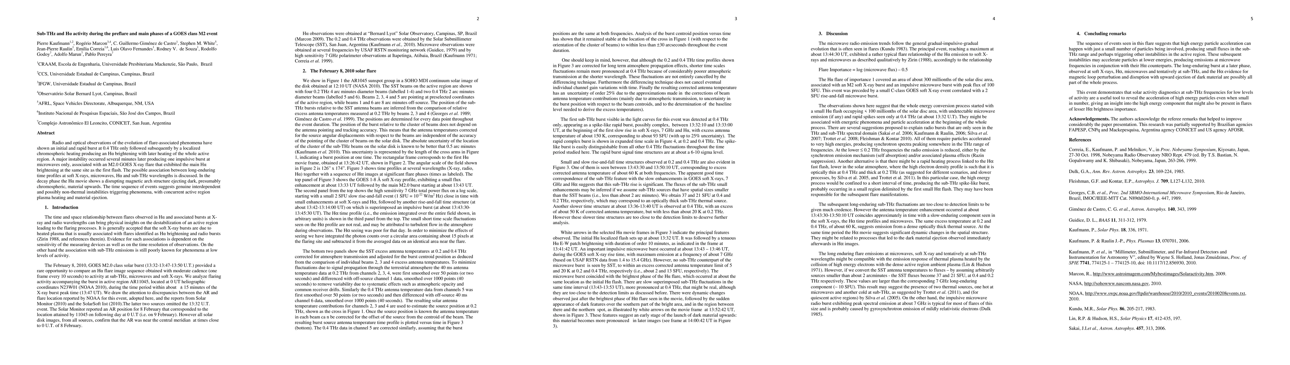 Radio and optical observations of the evolution of flare-associated phenomena have shown an initial and rapid burst at 0.4 THz only followed subsequently by a localized chromospheric heating producing an H{\alpha} brightening with later heating of the whole active region. A major instability occurred several minutes later producing one impulsive burst at microwaves only, associated with an M2.0 GOES X-ray flare that exhibited the main H{\alpha} brightening at the same site as the first flash. The possible association between long-enduring time profiles at soft X-rays, microwaves, H{\alpha} and sub-THz wavelengths is discussed. In the decay phase the H{\alpha} movie shows a disrupting magnetic arch structure ejecting dark, presumably chromospheric, material upwards. The time sequence of events suggests genuine interdependent and possibly non-thermal instabilities triggering phenomena, with concurrent active region plasma heating and material ejection.
