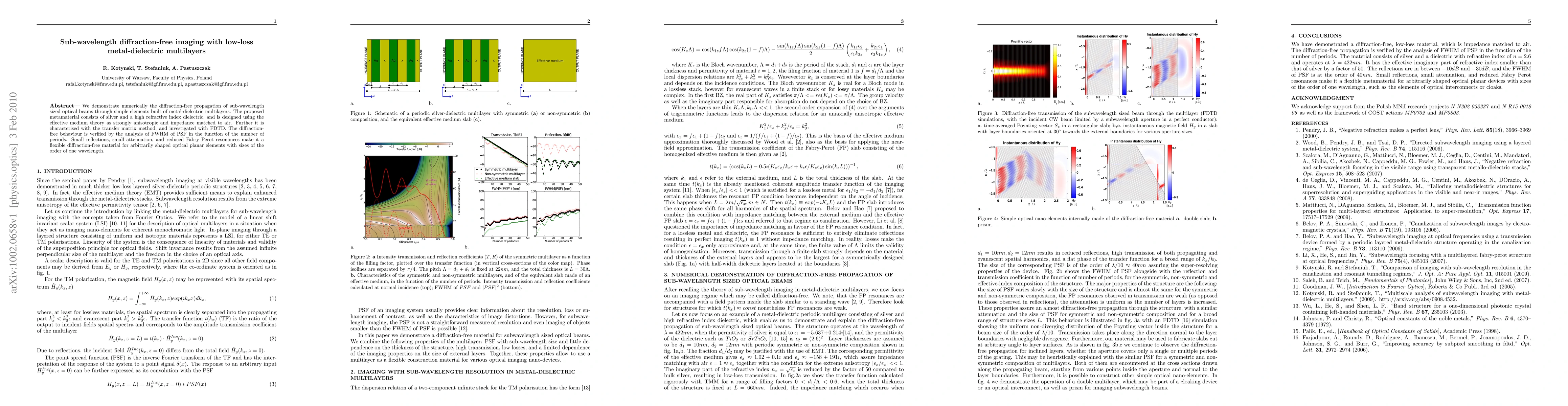 This paper demonstrates numerically the diffraction-free propagation of sub-wavelength optical beams through metal-dielectric multilayers using effective medium theory and FDTD simulations. The proposed metamaterial, composed of silver and a high refractive index dielectric, exhibits minimal reflections and attenuation, making it suitable for optical planar elements.