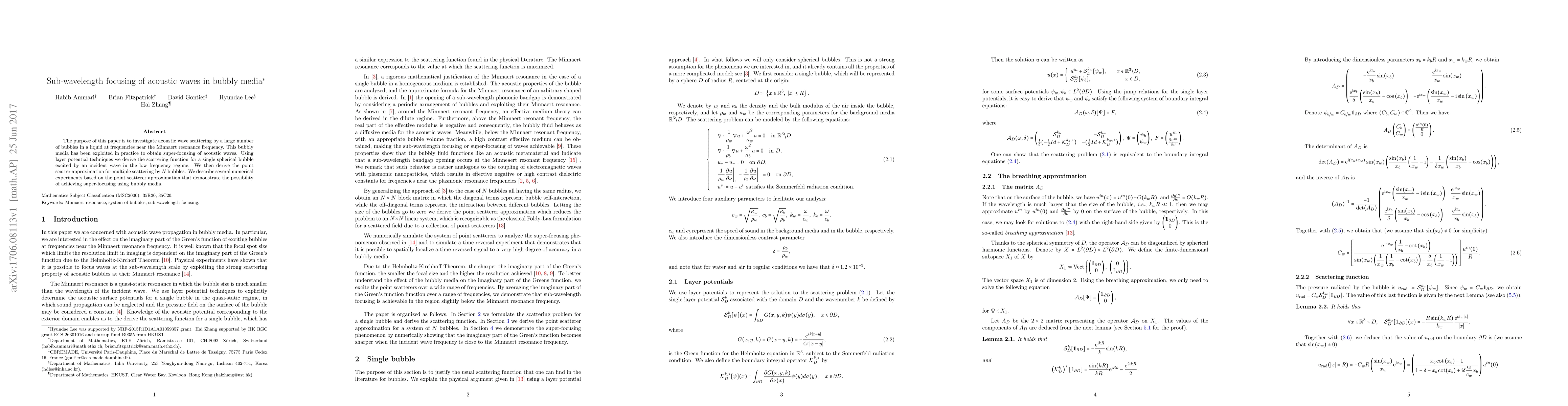 The purpose of this paper is to investigate acoustic wave scattering by a large number of bubbles in a liquid at frequencies near the Minnaert resonance frequency. This bubbly media has been exploited in practice to obtain super-focusing of acoustic waves. Using layer potential techniques we derive the scattering function for a single spherical bubble excited by an incident wave in the low frequency regime. We then derive the point scatter approximation for multiple scattering by N bubbles. We describe several numerical experiments based on the point scatterer approximation that demonstrate the possibility of achieving super-focusing using bubbly media.