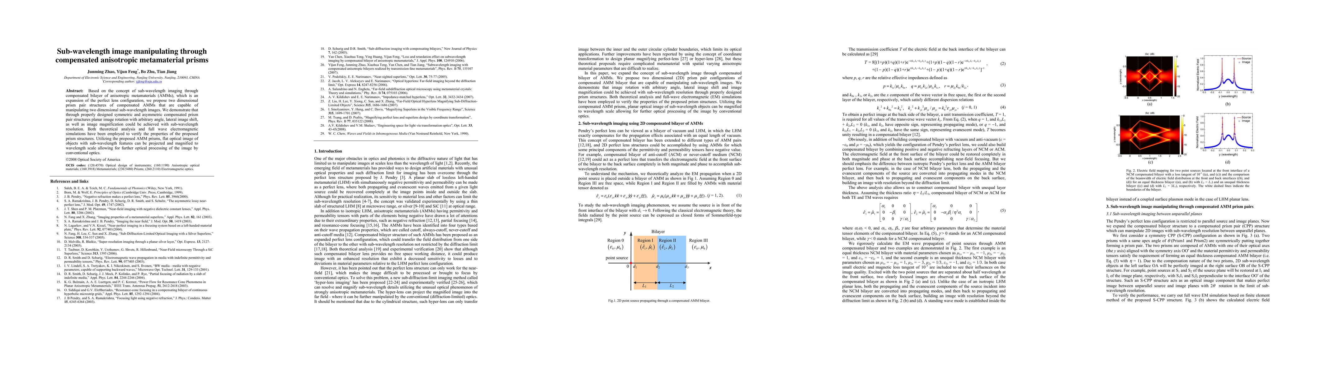Based on the concept of sub-wavelength imaging through compensated bilayer of anisotropic metamaterials (AMMs), which is an expansion of the perfect lens configuration, we propose two dimensional prism pair structures of compensated AMMs that are capable of manipulating two dimensional sub-wavelength images. We demonstrate that through properly designed symmetric and asymmetric compensated prism pair structures planar image rotation with arbitrary angle, lateral image shift, as well as image magnification could be achieved with sub-wavelength resolution. Both theoretical analysis and full wave electromagnetic simulations have been employed to verify the properties of the proposed prism structures. Utilizing the proposed AMM prisms, flat optical image of objects with sub-wavelength features can be projected and magnified to wavelength scale allowing for further optical processing of the image by conventional optics.