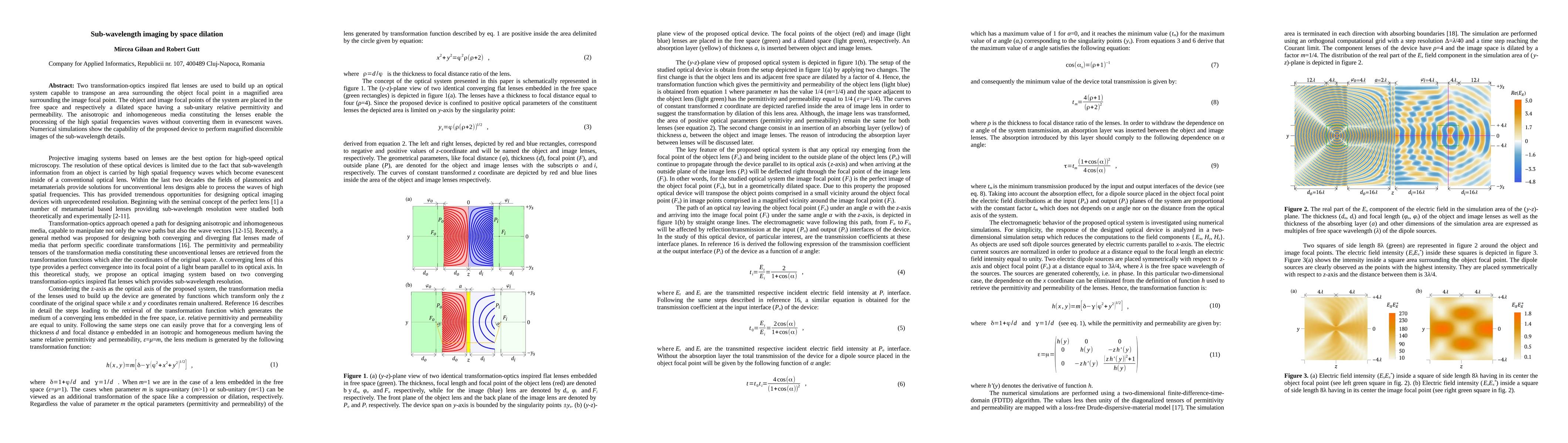 Two transformation-optics inspired flat lenses are used to build up an optical system capable to transpose an area surrounding the object focal point in a magnified area surrounding the image focal point. The object and image focal points of the system are placed in the free space and respectively a dilated space having a sub-unitary relative permittivity and permeability. The anisotropic and inhomogeneous media constituting the lenses enable the processing of the high spatial frequencies waves without converting them in evanescent waves. Numerical simulations show the capability of the proposed device to perform magnified discernible images of the sub-wavelength details.