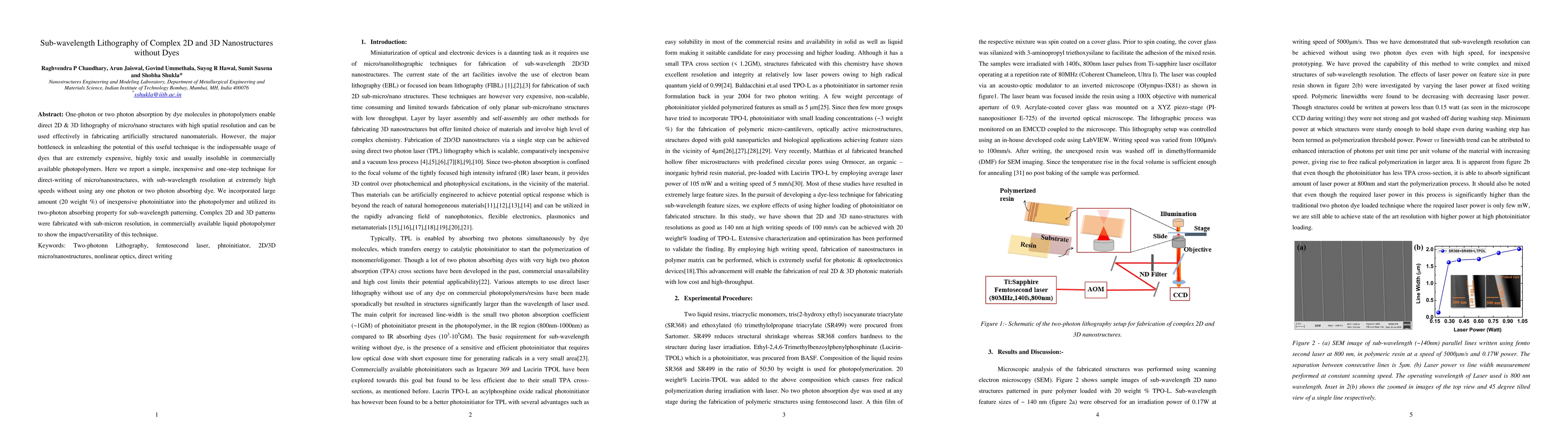 One-photon or two photon absorption by dye molecules in photopolymers enable direct 2D & 3D lithography of micro/nano structures with high spatial resolution and can be used effectively in fabricating artificially structured nanomaterials. However, the major bottleneck in unleashing the potential of this useful technique is the indispensable usage of dyes that are extremely expensive, highly toxic and usually insoluble in commercially available photopolymers. Here we report a simple, inexpensive and one-step technique for direct-writing of micro/nanostructures, with sub-wavelength resolution at extremely high speeds without using any one photon or two photon absorbing dye. We incorporated large amount (20 weight %) of inexpensive photoinitiator into the photopolymer and utilized its two-photon absorbing property for sub-wavelength patterning. Complex 2D and 3D patterns were fabricated with sub-micron resolution, in commercially available liquid photopolymer to show the impact/versatility of this technique.