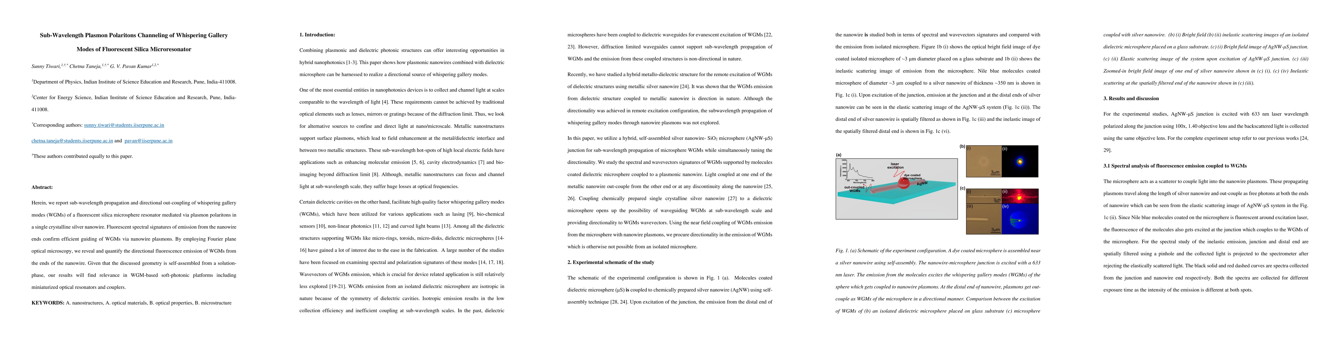 Herein, we report sub-wavelength propagation and directional out-coupling of whispering gallery modes (WGMs) of a fluorescent silica microsphere resonator mediated via plasmon polaritons in a single crystalline silver nanowire. Fluorescent spectral signatures of emission from the nanowire ends confirm efficient guiding of WGMs via nanowire plasmons. By employing Fourier plane optical microscopy, we reveal and quantify the directional fluorescence emission of WGMs from the ends of the nanowire. Given that the discussed geometry is self-assembled from a solution-phase, our results will find relevance in WGM-based soft-photonic platforms including miniaturized optical resonators and couplers.