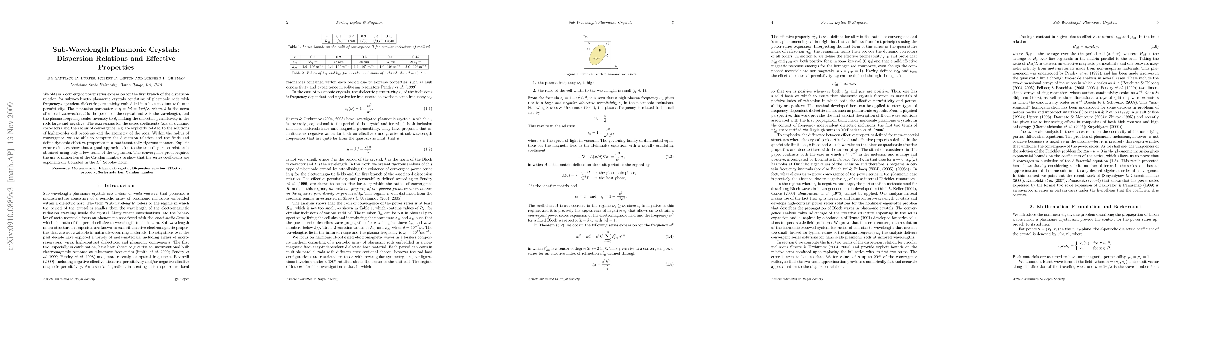 We obtain a convergent power series expansion for the first branch of the dispersion relation for subwavelength plasmonic crystals consisting of plasmonic rods with frequency-dependent dielectric permittivity embedded in a host medium with unit permittivity. The expansion parameter is $\eta=kd=2\pi d/\lambda$, where $k$ is the norm of a fixed wavevector, $d$ is the period of the crystal and $\lambda$ is the wavelength, and the plasma frequency scales inversely to $d$, making the dielectric permittivity in the rods large and negative. The expressions for the series coefficients (a.k.a., dynamic correctors) and the radius of convergence in $\eta$ are explicitly related to the solutions of higher-order cell problems and the geometry of the rods. Within the radius of convergence, we are able to compute the dispersion relation and the fields and define dynamic effective properties in a mathematically rigorous manner. Explicit error estimates show that a good approximation to the true dispersion relation is obtained using only a few terms of the expansion. The convergence proof requires the use of properties of the Catalan numbers to show that the series coefficients are exponentially bounded in the $H^1$ Sobolev norm.
