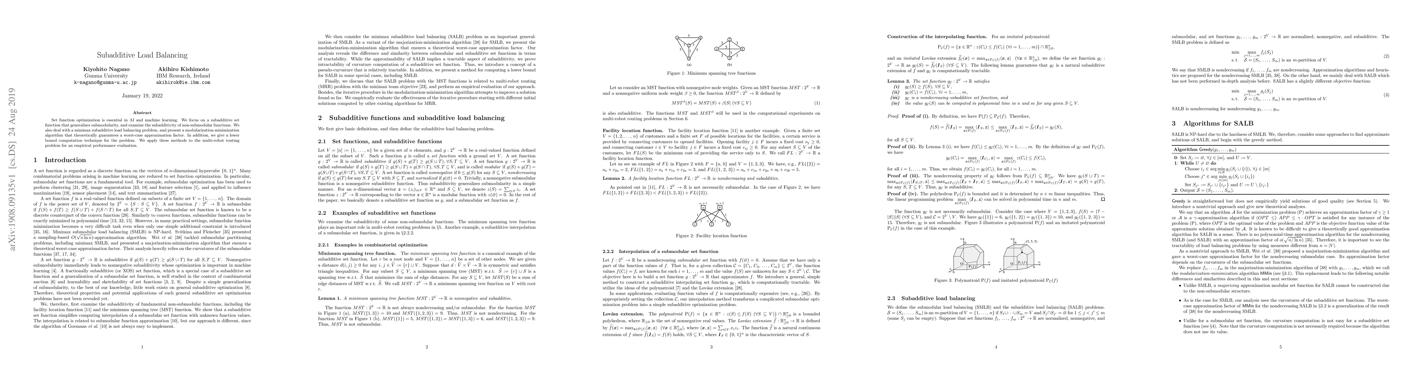 Set function optimization is essential in AI and machine learning. We focus on a subadditive set function that generalizes submodularity, and examine the subadditivity of non-submodular functions. We also deal with a minimax subadditive load balancing problem, and present a modularization-minimization algorithm that theoretically guarantees a worst-case approximation factor. In addition, we give a lower bound computation technique for the problem. We apply these methods to the multi-robot routing problem for an empirical performance evaluation.