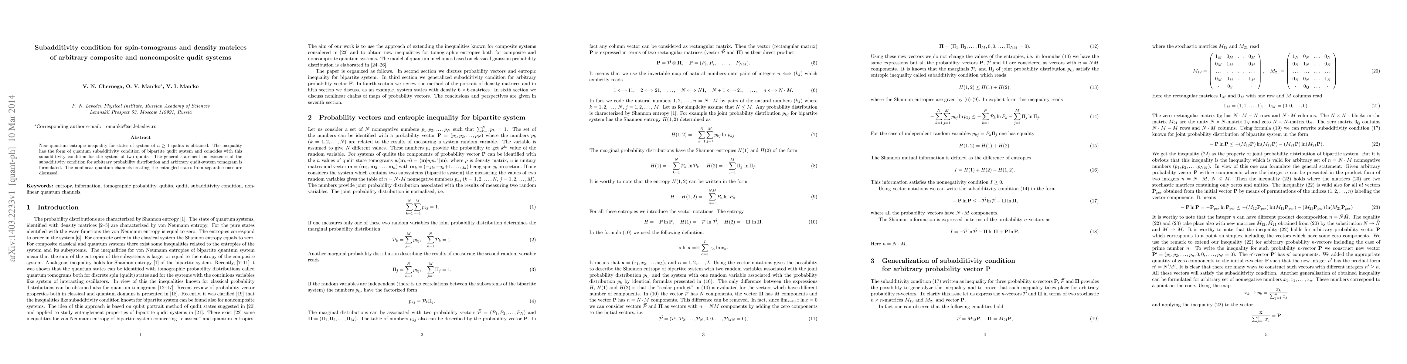 New quantum entropic inequality for states of system of n >_ 1 qudits is obtained. The inequality has the form of quantum subadditivity condition of bipartite qudit system and coincides with this subadditivity condition for the system of two qudits. The general statement on existence of the subadditivity condition for arbitrary probability distribution and arbitrary qudit-system tomogram is formulated. The nonlinear quantum channels creating the entangled states from separable ones are discussed.