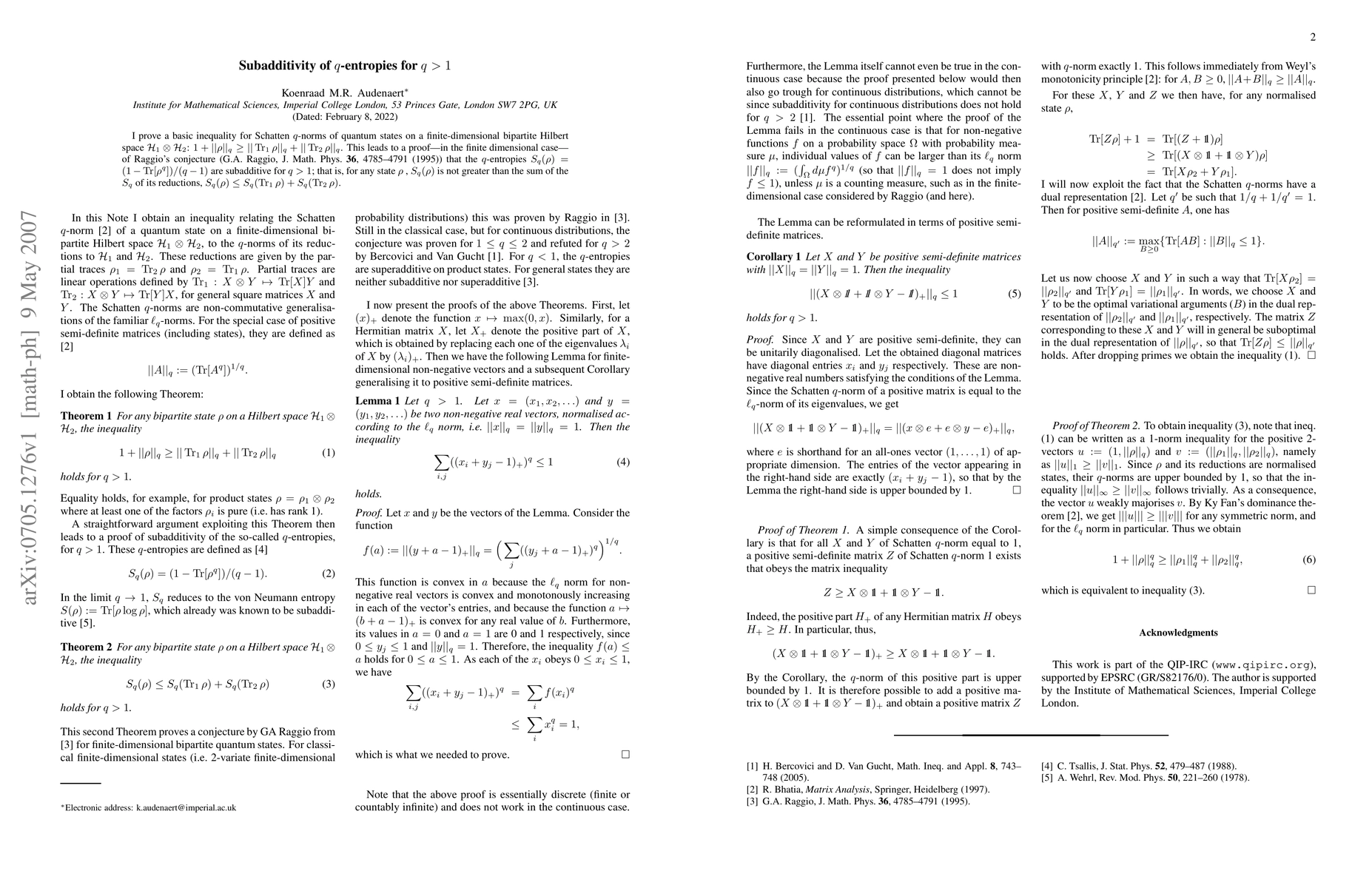 Researchers prove a basic inequality for Schatten q-norms of quantum states, showing that q-entropies are subadditive for q > 1, supporting Raggio's conjecture.