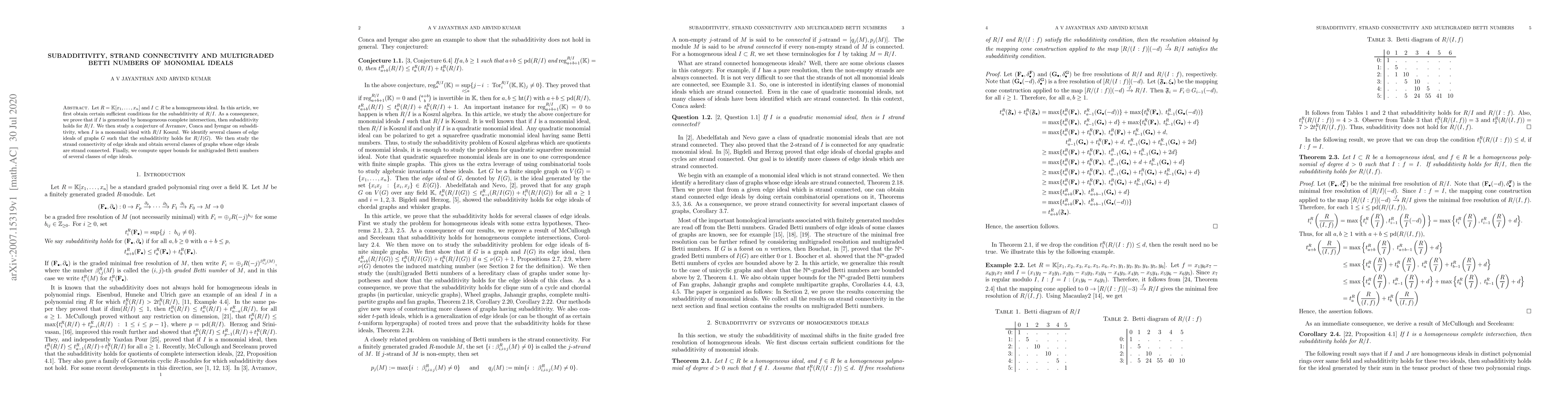 This paper investigates sufficient conditions for the subadditivity of quotient rings $R/I$ where $I$ is a homogeneous ideal in $R = \mathbb{K}[x_1, \ldots, x_n]$. It proves subadditivity for complete intersection monomial ideals and explores strand connectivity and multigraded Betti numbers for edge ideals of graphs.