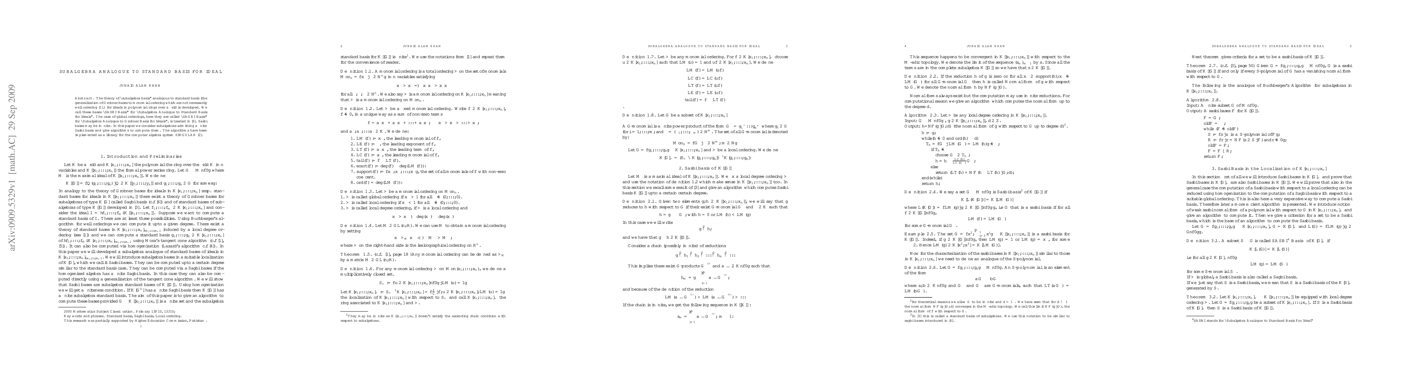 The theory of "subalgebra basis" analogous to standard basis (the generalization of Gr\"{o}bner bases to monomial ordering which are not necessarily well ordering \cite{GP1}.) for ideals in polynomial rings over a field is developed. We call these bases "SASBI Basis" for "Subalgebra Analogue to Standard Basis for Ideals". The case of global orderings, here they are called "SAGBI Basis" for "Subalgebra Analogue to Gr\"{o}bner Basis for Ideals", is treated in \cite{RS1}. Sasbi bases may be infinite. In this paper we consider subalgebras admitting a finite Sasbi basis and give algorithms to compute them. The algorithms have been implemented as a library for the computer algebra system SINGULAR \cite{GPS1}.