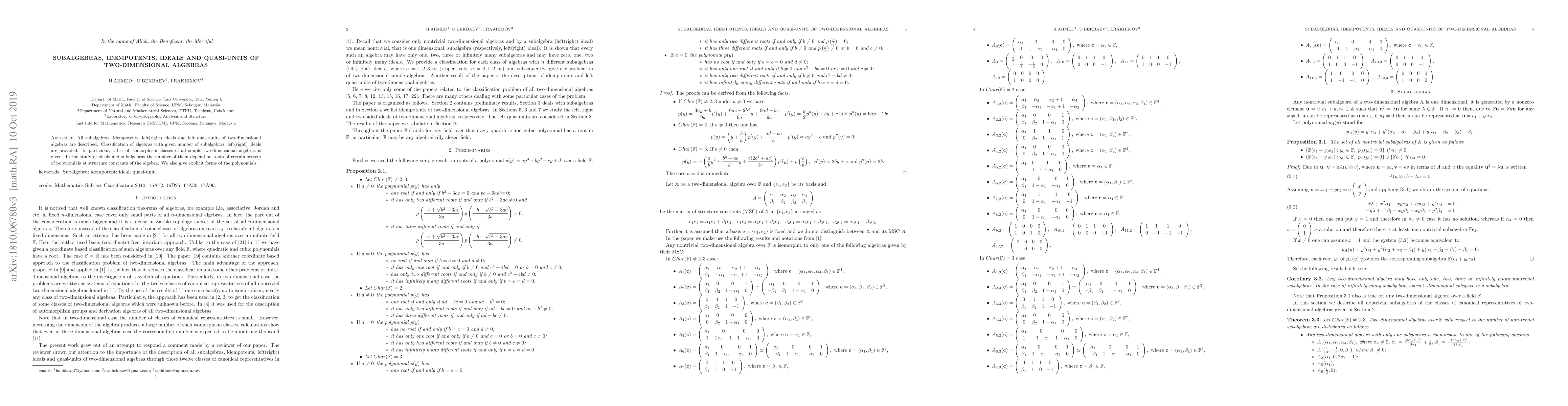 This paper classifies two-dimensional algebras by detailing their subalgebras, idempotents, left and right ideals, and left quasi-units. It provides explicit forms of polynomials whose roots determine the number of these algebraic structures, and lists all isomorphism classes of simple two-dimensional algebras.