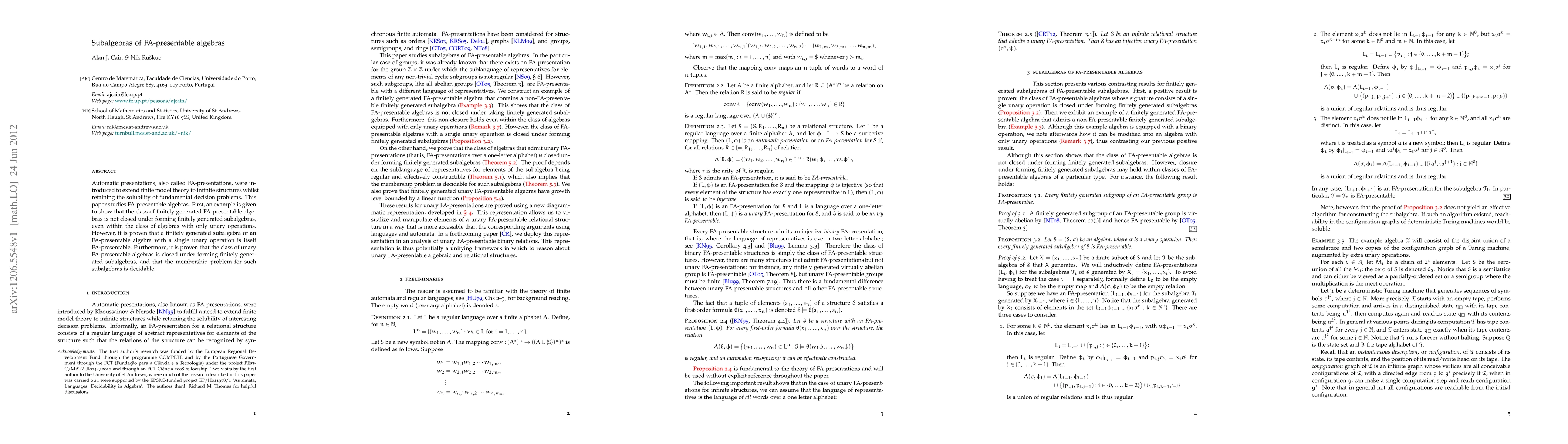 The paper explores the properties of FA-presentable algebras, showing that not all finitely generated subalgebras of such algebras retain FA-presentability, but those with a single unary operation do.