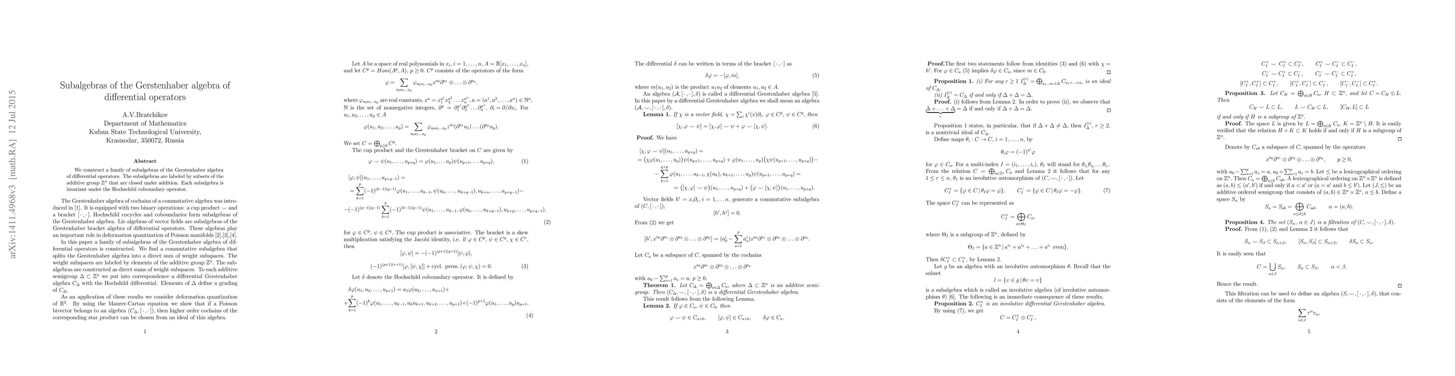 We construct a family of subalgebras of the Gerstenhaber algebra of differential operators. The subalgebras are labeled by subsets of the additive group ${\mathbb Z}^n$ that are closed under addition. Each subalgebra is invariant under the Hochschild coboundary operator.