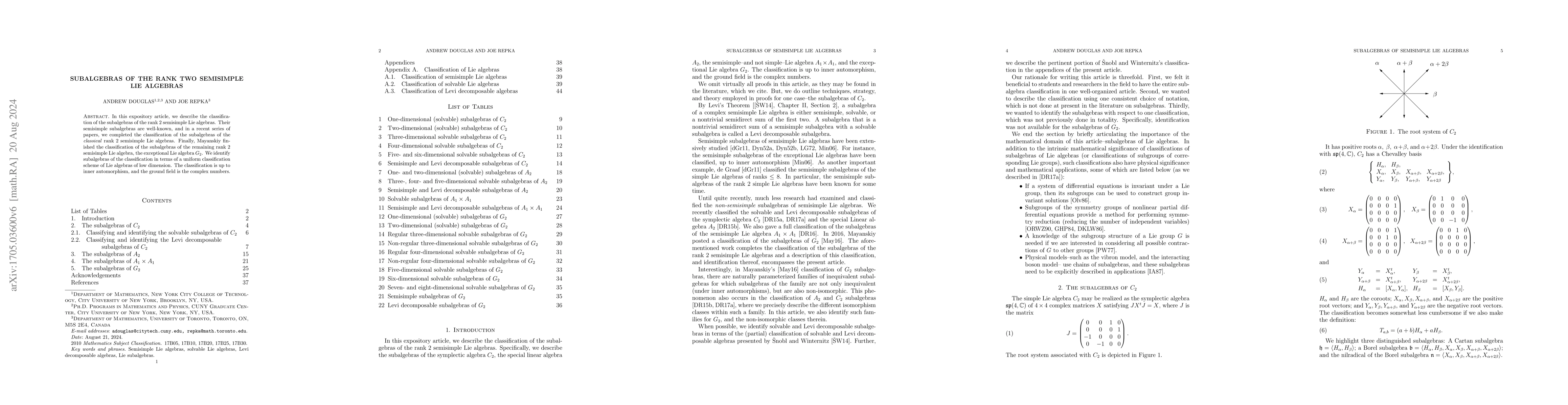 In this expository article, we describe the classification of the subalgebras of the rank 2 semisimple Lie algebras. Their semisimple subalgebras are well-known, and in a recent series of papers, we completed the classification of the subalgebras of the classical rank 2 semisimple Lie algebras. Finally, Mayanskiy finished the classification of the subalgebras of the remaining rank 2 semisimple Lie algebra, the exceptional Lie algebra $G_2$. We identify subalgebras of the classification in terms of a uniform classification scheme of Lie algebras of low dimension. The classification is up to inner automorphism, and the ground field is the complex numbers.