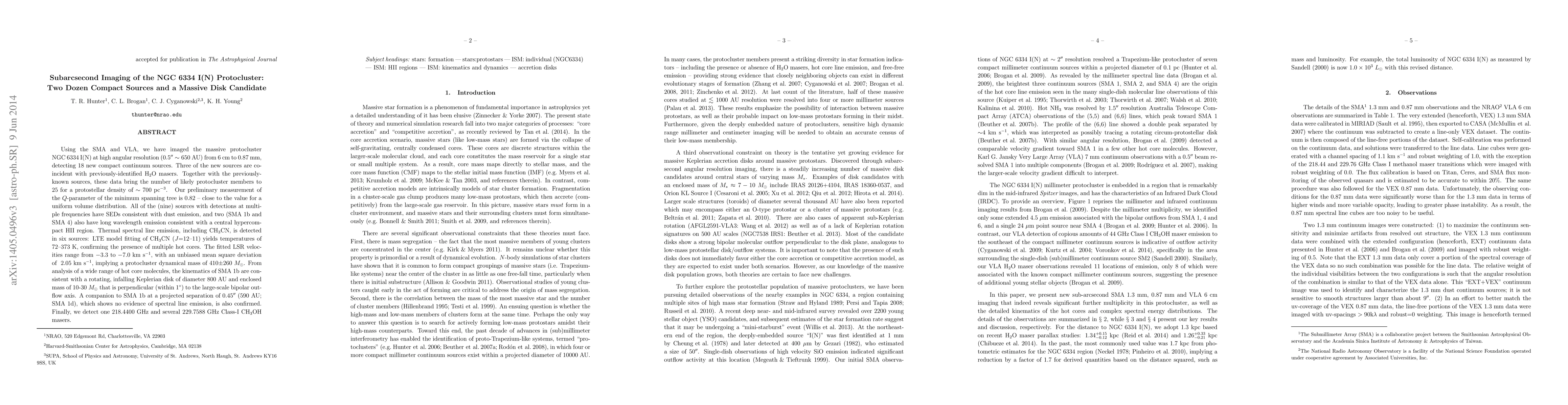Using the SMA and VLA, we have imaged the massive protocluster NGC6334I(N) at high angular resolution (0.5"~650AU) from 6cm to 0.87mm, detecting 18 new compact continuum sources. Three of the new sources are coincident with previously-identified water masers. Together with the previously-known sources, these data bring the number of likely protocluster members to 25 for a protostellar density of ~700 pc^-3. Our preliminary measurement of the Q-parameter of the minimum spanning tree is 0.82 -- close to the value for a uniform volume distribution. All of the (nine) sources with detections at multiple frequencies have SEDs consistent with dust emission, and two (SMA1b and SMA4) also have long wavelength emission consistent with a central hypercompact HII region. Thermal spectral line emission, including CH3CN, is detected in six sources: LTE model fitting of CH3CN(J=12-11) yields temperatures of 72-373K, confirming the presence of multiple hot cores. The fitted LSR velocities range from -3.3 to -7.0 km/s, with an unbiased mean square deviation of 2.05 km/s, implying a dynamical mass of 410+-260 Msun for the protocluster. From analysis of a wide range of hot core molecules, the kinematics of SMA1b are consistent with a rotating, infalling Keplerian disk of diameter 800AU and enclosed mass of 10-30 Msun that is perpendicular (within 1 degree) to the large-scale bipolar outflow axis. A companion to SMA1b at a projected separation of 0.45" (590AU; SMA1d), which shows no evidence of spectral line emission, is also confirmed. Finally, we detect one 218.440GHz and several 229.7588GHz Class-I methanol masers.