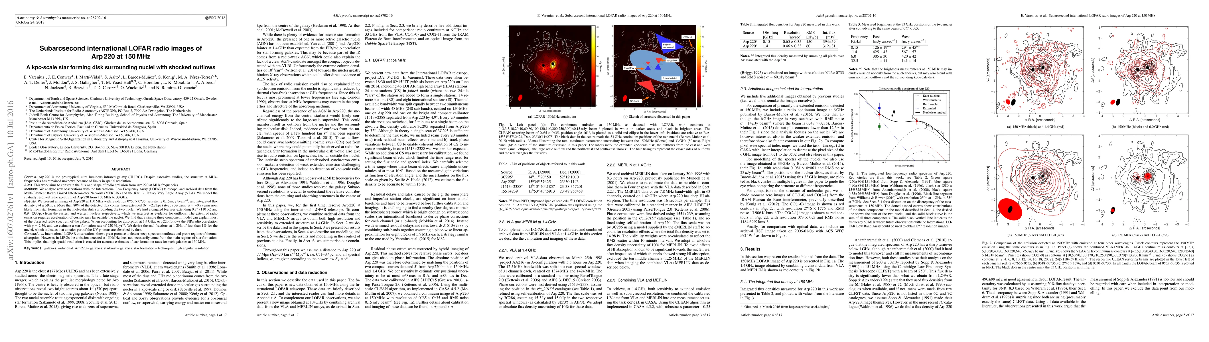This study utilizes LOFAR, MERLIN, and VLA data to create a high-resolution 150 MHz image of Arp 220, revealing a kpc-scale star-forming disk and evidence of outflows. The analysis suggests that most radio emission originates from star formation in the disk, while outflows extend from the nuclei, indicating cosmic ray acceleration beyond the nuclei.