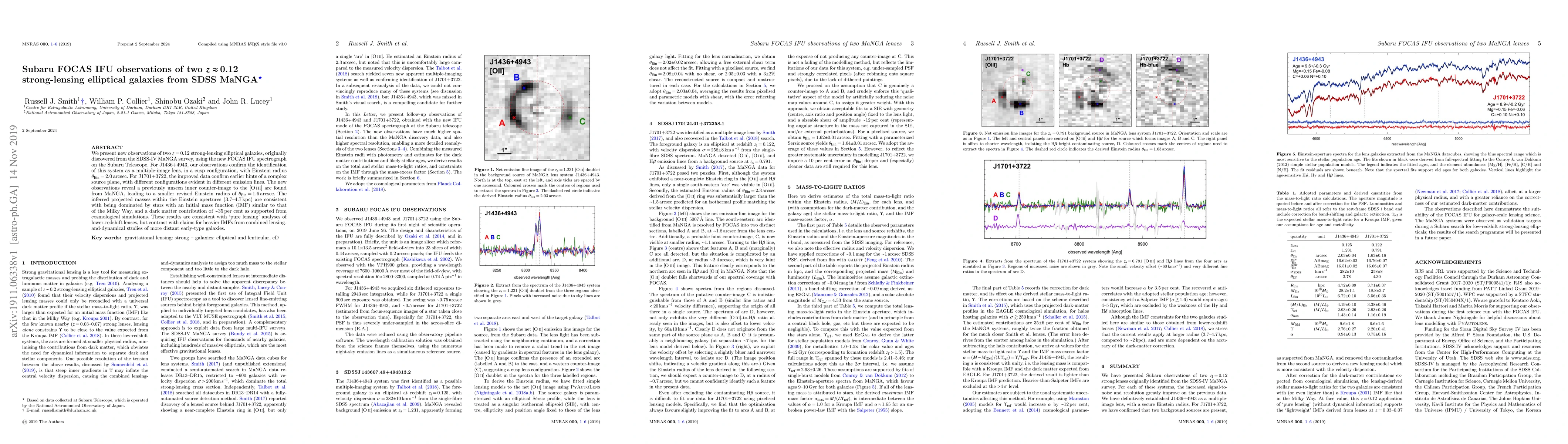 We present new observations of two z=0.12 strong-lensing elliptical galaxies, originally discovered from the SDSS-IV MaNGA survey, using the new FOCAS IFU spectrograph on the Subaru Telescope. For J1436+4943, our observations confirm the identification of this system as a multiple-image lens, in a cusp configuration, with Einstein radius $\theta_{Ein}$=2.0 arcsec. For J1701+3722, the improved data confirm earlier hints of a complex source plane, with different configurations evident in different emission lines. The new observations reveal a previously unseen inner counter-image to the [OIII] arc found from MaNGA, leading to a smaller revised Einstein radius of $\theta_{Ein}$=1.6 arcsec. The inferred projected masses within the Einstein apertures (3.7-4.7kpc) are consistent with being dominated by stars with an initial mass function (IMF) similar to that of the Milky Way, and a dark matter contribution of ~35 per cent as supported from cosmological simulations. These results are consistent with `pure lensing' analyses of lower-redshift lenses, but contrast with claims for heavier IMFs from combined lensing-and-dynamical studies of more distant early-type galaxies.