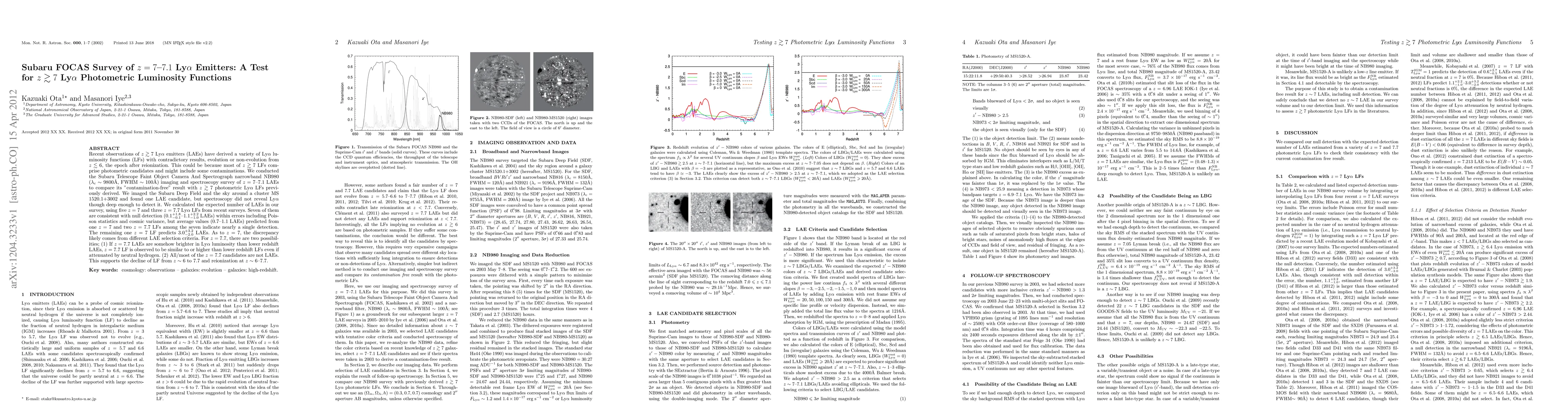 This study uses Subaru FOCAS survey data to compare the Ly{\alpha} luminosity function (LF) of z=7-7.1 Ly{\alpha} emitters (LAEs) to previous photometric LFs at z >~ 7, finding discrepancies likely due to contamination in photometric surveys. The survey found no LAEs, suggesting a decline in LF from z ~ 6 to 7.7, supporting reionization at z ~ 6-7.7.