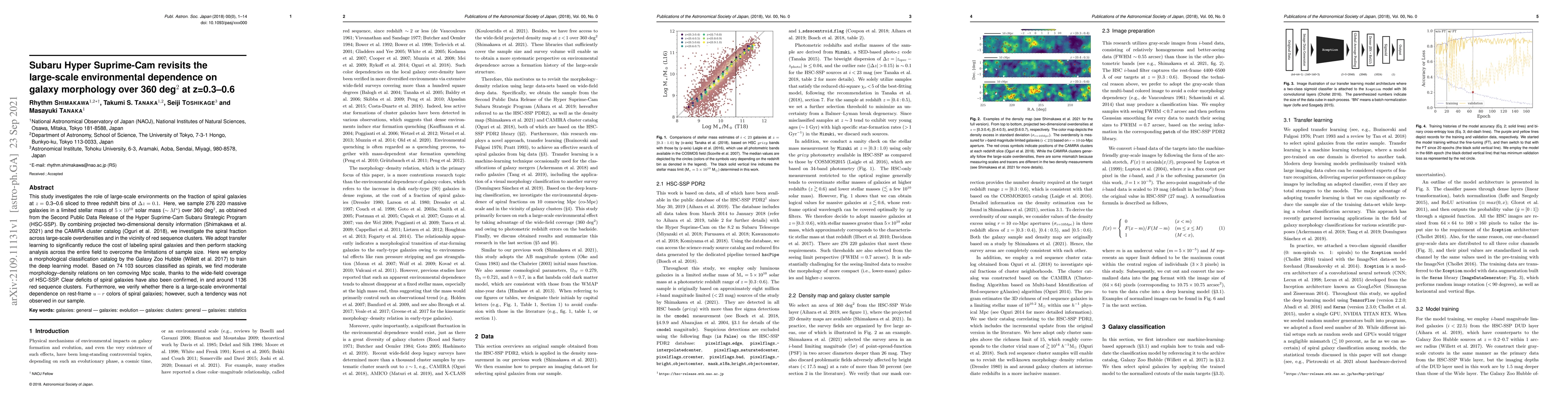 This study investigates the role of large-scale environments on the fraction of spiral galaxies at $z=$ 0.3-0.6 sliced to three redshift bins of $\Delta z=0.1$. Here, we sample 276220 massive galaxies in a limited stellar mass of $5\times10^{10}$ solar mass ($\sim M^\ast$) over 360 deg$^2$, as obtained from the Second Public Data Release of the Hyper Suprime-Cam Subaru Strategic Program (HSC-SSP). By combining projected two-dimensional density information (Shimakawa et al. 2021) and the CAMIRA cluster catalog (Oguri et al. 2018), we investigate the spiral fraction across large-scale overdensities and in the vicinity of red sequence clusters. We adopt transfer learning to significantly reduce the cost of labeling spiral galaxies and then perform stacking analysis across the entire field to overcome the limitations of sample size. Here we employ a morphological classification catalog by the Galaxy Zoo Hubble (Willet et al. 2017) to train the deep learning model. Based on 74103 sources classified as spirals, we find moderate morphology-density relations on ten comoving Mpc scale, thanks to the wide-field coverage of HSC-SSP. Clear deficits of spiral galaxies have also been confirmed, in and around 1136 red sequence clusters. Furthermore, we verify whether there is a large-scale environmental dependence on rest-frame $u-r$ colors of spiral galaxies; however, such a tendency was not observed in our sample.