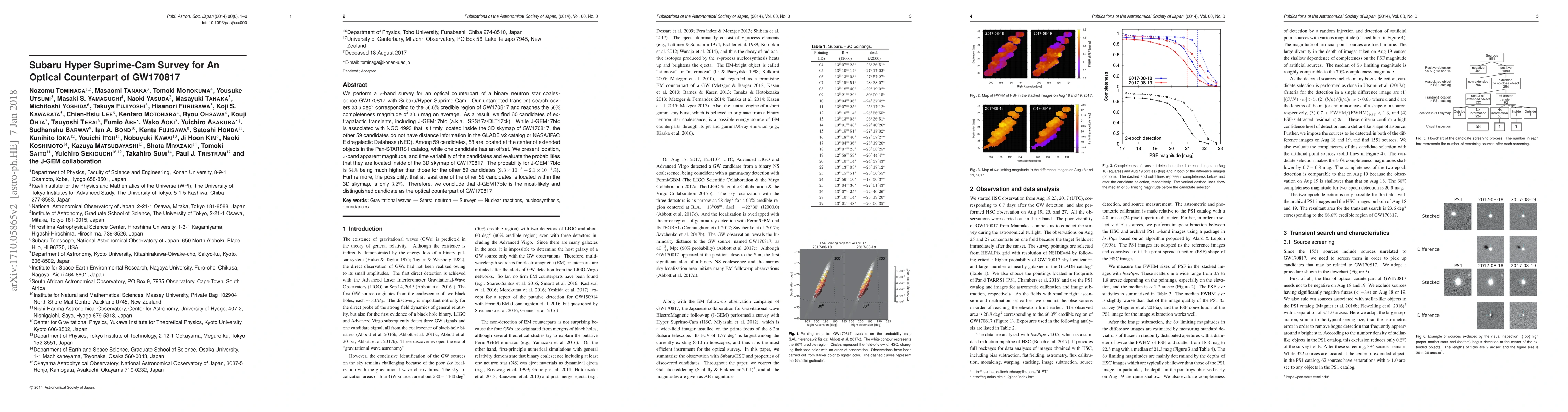 The Subaru Hyper Suprime-Cam Survey identified 60 transient candidates for the optical counterpart of GW170817, with J-GEM17btc (SSS17a/DLT17ck) showing the highest probability of association at 64% within the 3D skymap, while the other 59 candidates have negligible probabilities and lack distance information.
