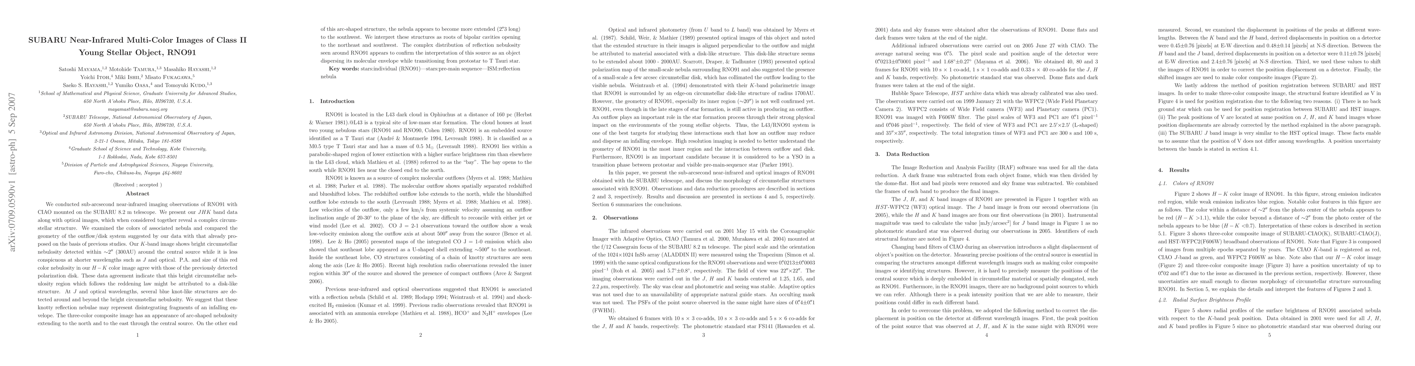 We conducted sub-arcsecond near-infrared imaging observations of RNO91 with CIAO mounted on the SUBARU 8.2 m telescope. We present our JHK band data along with optical images, which when considered together reveal a complex circumstellar structure. We examined the colors of associated nebula and compared the geometry of the outflow/disk system suggested by our data with that already proposed on the basis of previous studies. Our K-band image shows bright circumstellar nebulosity detected within 2"(300AU) around the central source while it is less conspicuous at shorter wavelengths such as J and optical. P.A. and size of this red color nebulosity in our H-K color image agree with those of the previously detected polarization disk. These data agreement indicate that this bright circumstellar nebulosity region which follows the reddening law might be attributed to a disk-like structure. At J and optical wavelengths, several blue knot-like structures are detected around and beyond the bright circumstellar nebulosity. We suggest that these knotty reflection nebulae may represent disintegrating fragments of an infalling envelope. The three-color composite image has an appearance of arc-shaped nebulosity extending to the north and to the east through the central source. On the other end of this arc-shaped structure, the nebula appears to become more extended (2."3 long) to the southwest. We interpret these structures as roots of bipolar cavities opening to the northeast and southwest. The complex distribution of reflection nebulosity seen around RNO91 appears to confirm the interpretation of this source as an object dispersing its molecular envelope while transitioning from protostar to T Tauri star.