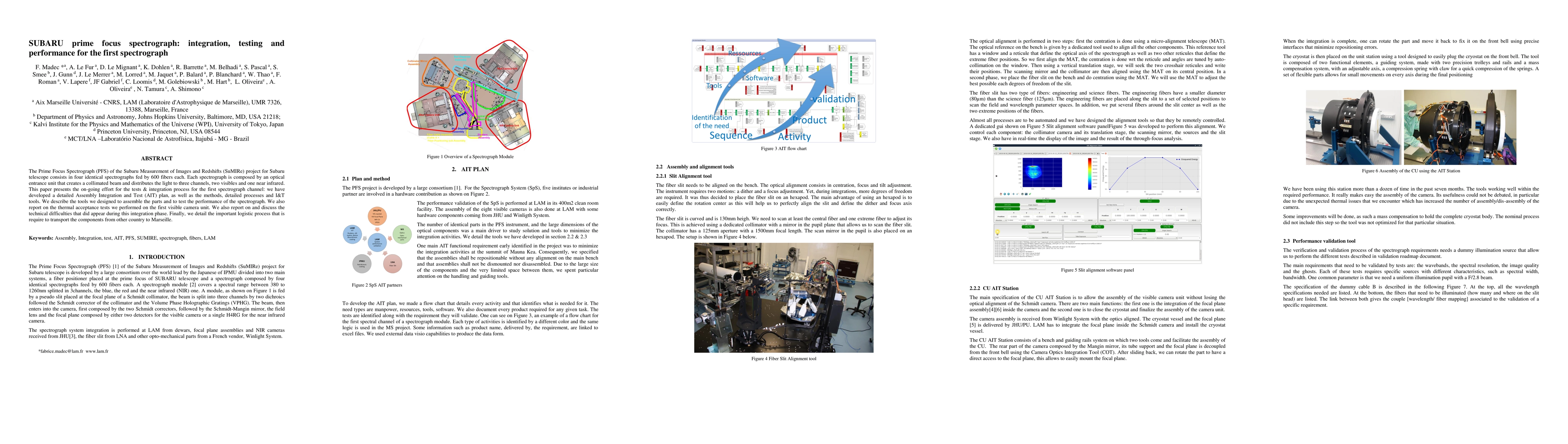 This paper details the integration, testing, and performance of the first spectrograph channel for the Subaru Prime Focus Spectrograph (PFS), including the Assembly Integration and Test (AIT) plan, thermal acceptance tests, and logistical challenges in transporting components from abroad. It also discusses technical difficulties encountered during the integration phase.