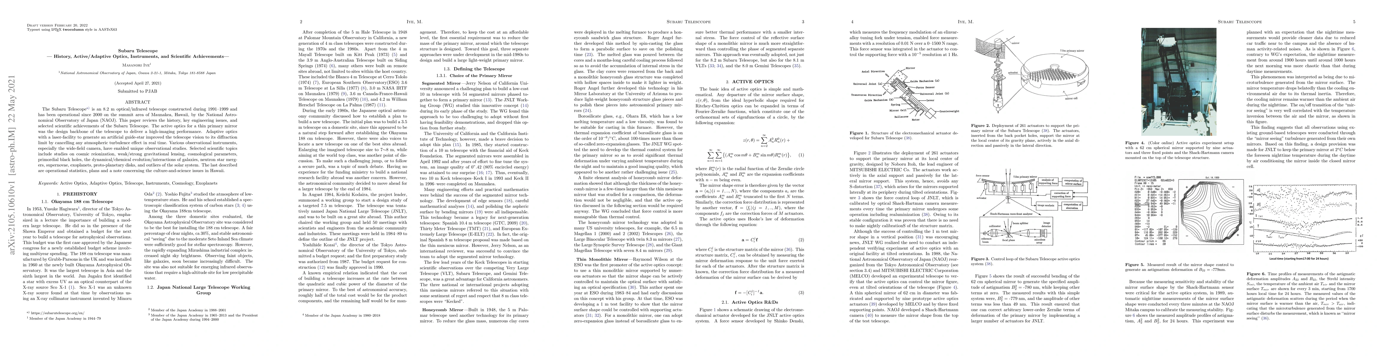 The Subaru Telescope, an 8.2 m optical/infrared telescope on Maunakea, Hawaii, employs active and adaptive optics to achieve high-imaging performance and has made significant scientific contributions in areas such as cosmic reionization and exoplanet studies.