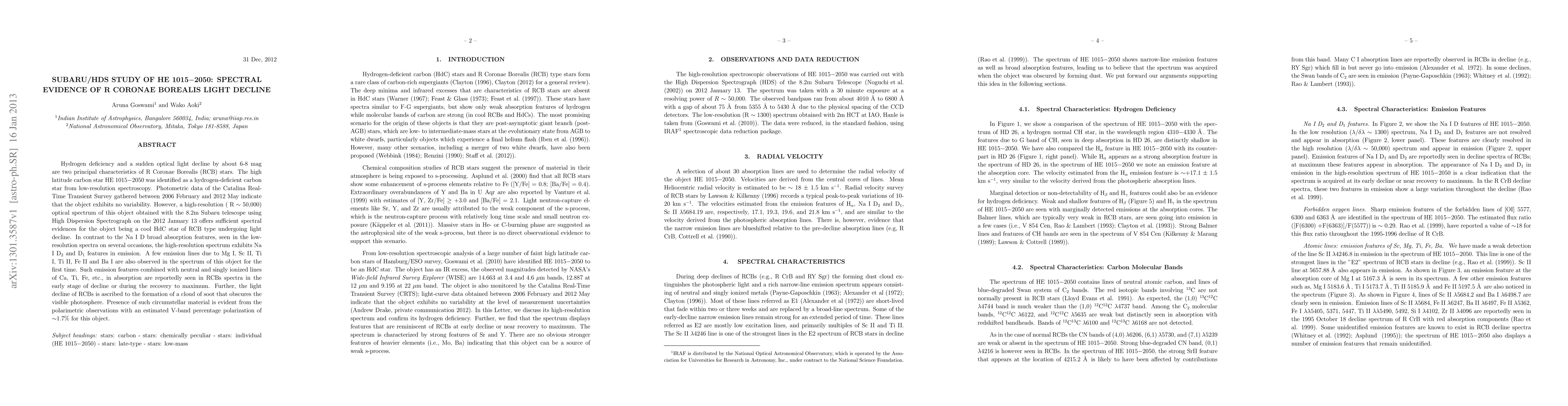 The Subaru/HDS study of HE 1015-2050 reveals spectral evidence of R Coronae Borealis light decline, characterized by hydrogen deficiency, emission lines, and circumstellar material. The high-resolution spectrum shows Na I D2 and D1 in emission, indicative of the star's transition to the decline phase of its lifecycle.