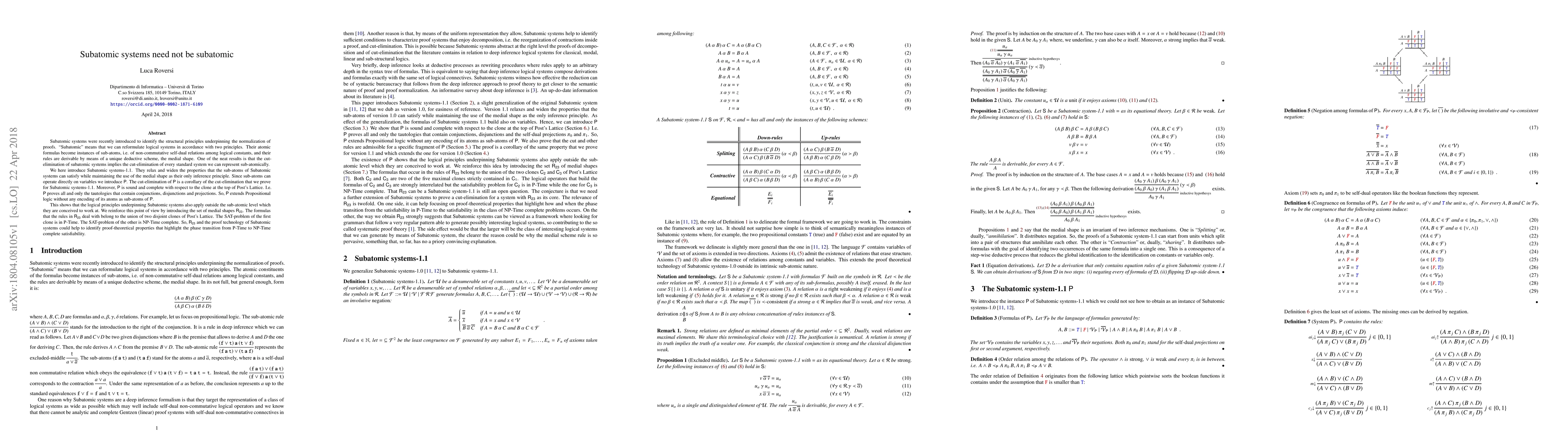 Subatomic systems were recently introduced to identify the structural principles underpinning the normalization of proofs. "Subatomic" means that we can reformulate logical systems in accordance with two principles. Their atomic formulas become instances of sub-atoms, non-commutative self-dual relations among logical constants, and their rules are derivable by means of a unique deductive scheme, the medial shape. One of the results is that the cut-elimination of subatomic systems implies the cut-elimination of every standard system we can represent sub-atomically. We here introduce Subatomic systems-1.1. They relax and widen the properties that the sub-atoms of Subatomic systems can satisfy while maintaining the use of the medial shape as their only inference principle. Since sub-atoms can operate directly on variables we introduce P. The cut-elimination of P is a corollary of the cut-elimination that we prove for Subatomic systems-1.1. Moreover, P is sound and complete with respect to the clone at the top of Post's Lattice. I.e. P proves all and only the tautologies that contain conjunctions, disjunctions and projections. So, P extends Propositional logic without any encoding of its atoms as sub-atoms of P. This shows that the logical principles underpinning Subatomic systems also apply outside the sub-atomic level which they are conceived to work at. We reinforce this point of view by introducing the set R of medial shapes. The formulas that the rules in R deal with belong to the union of two disjoint clones of Post's Lattice. The SAT-problem of the first clone is in P-Time. The SAT-problem of the other is NP-Time complete. So, R and the proof technology of Subatomic systems could help to identify proof-theoretical properties that highlight the phase transition from P-Time to NP-Time complete satisfiability.