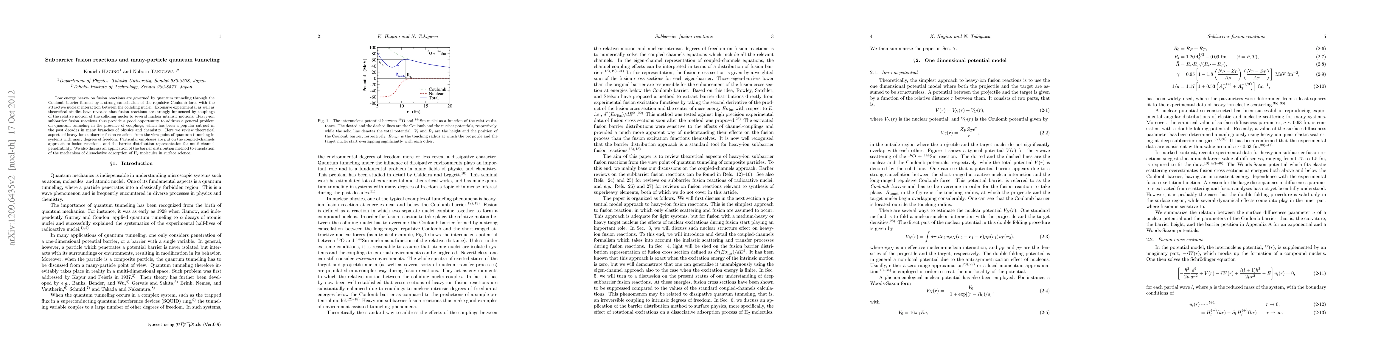 This paper reviews theoretical aspects of heavy-ion subbarrier fusion reactions, focusing on quantum tunneling through the Coulomb barrier in systems with many degrees of freedom. It emphasizes the coupled-channels approach and barrier distribution representation for multi-channel penetrability, and applies these concepts to dissociative adsorption of H$_2$ molecules.