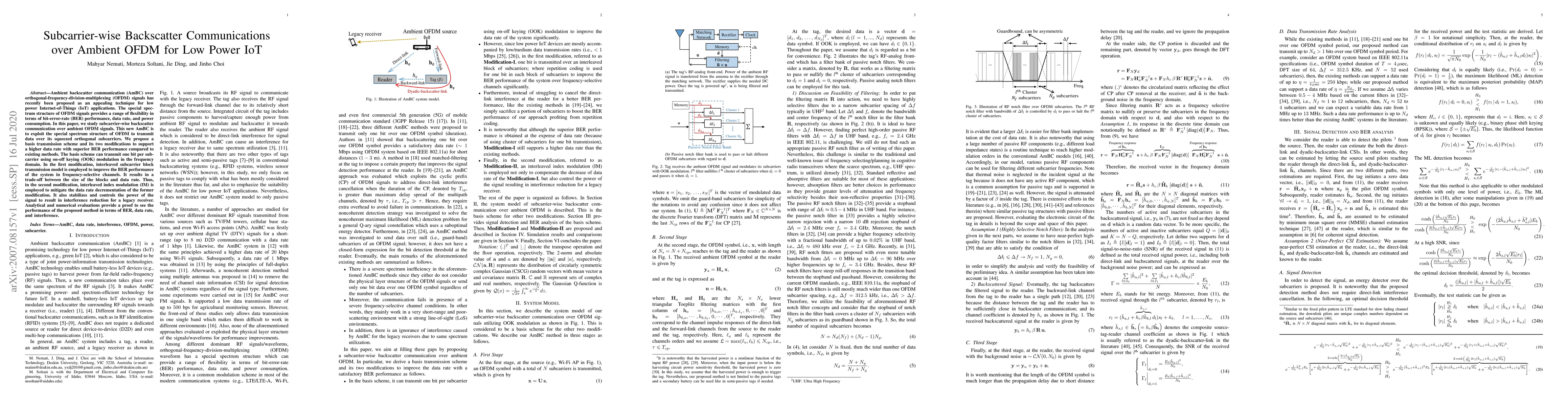 The paper proposes subcarrier-wise backscatter communication over ambient OFDM signals, analyzing a basis transmission scheme and its modifications for low power IoT applications.