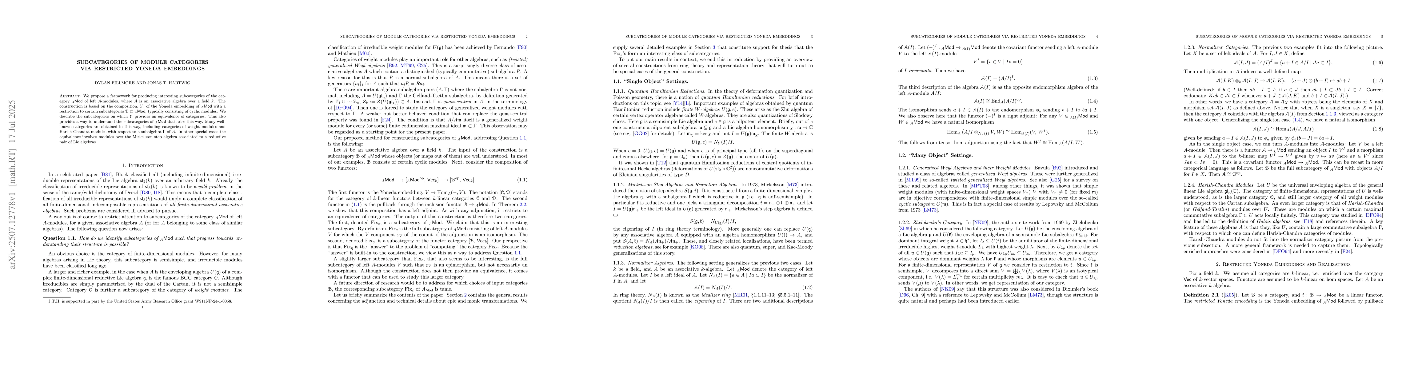 We propose a framework for producing interesting subcategories of the category ${}_A\mathsf{Mod}$ of left $A$-modules, where $A$ is an associative algebra over a field $k$. The construction is based on the composition, $Y$, of the Yoneda embedding of ${}_A\mathsf{Mod}$ with a restriction to certain subcategories $\mathcal{B}\subset {}_A\mathsf{Mod}$, typically consisting of cyclic modules. We describe the subcategories on which $Y$ provides an equivalence of categories. This also provides a way to understand the subcategories of ${}_A\mathsf{Mod}$ that arise this way. Many well-known categories are obtained in this way, including categories of weight modules and Harish-Chandra modules with respect to a subalgebra $\Gamma$ of $A$. In other special cases the equivalence involves modules over the Mickelsson step algebra associated to a reductive pair of Lie algebras.