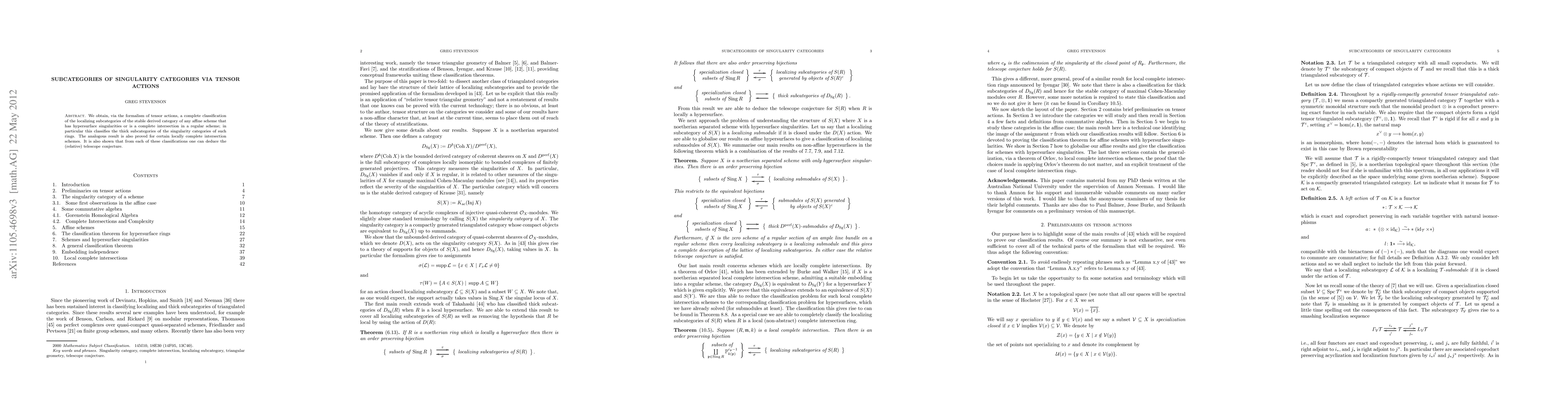 We obtain, via the formalism of tensor actions, a complete classification of the localizing subcategories of the stable derived category of any affine scheme with hypersurface singularities and of any local complete intersection over a field; in particular this classifies the thick subcategories of the singularity categories of such rings. The analogous result is also proved for certain locally complete intersection schemes. It is also shown that from each of these classifications one can deduce the (relative) telescope conjecture.