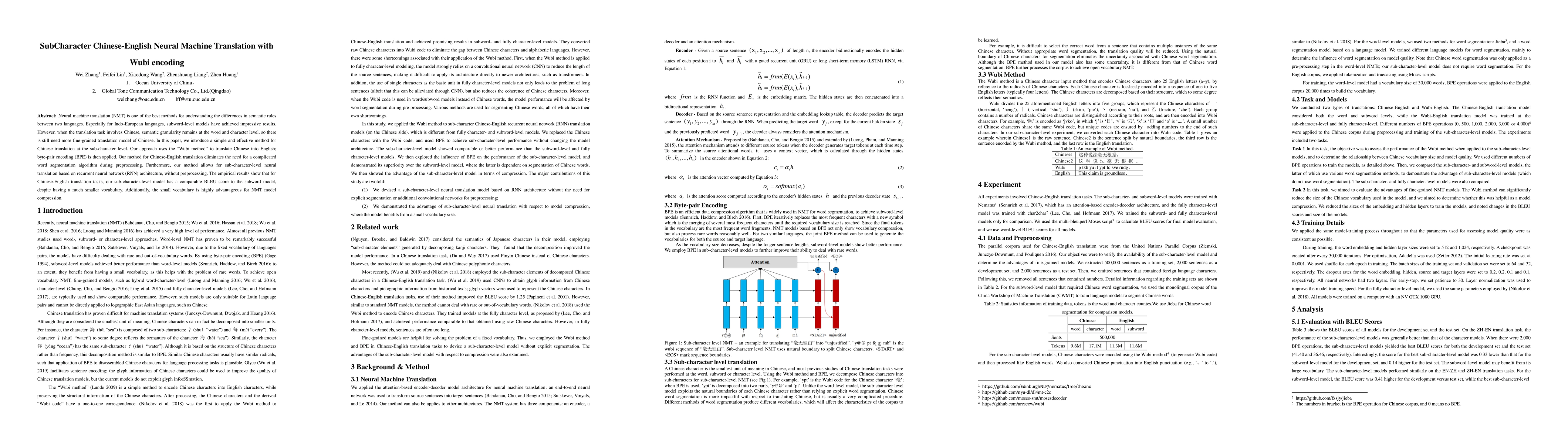 This paper presents a neural machine translation method using Wubi encoding and byte-pair encoding (BPE) for sub-character level Chinese-English translation, eliminating the need for complex word segmentation. The sub-character model achieves comparable translation quality to subword models with a significantly smaller vocabulary, beneficial for model compression.