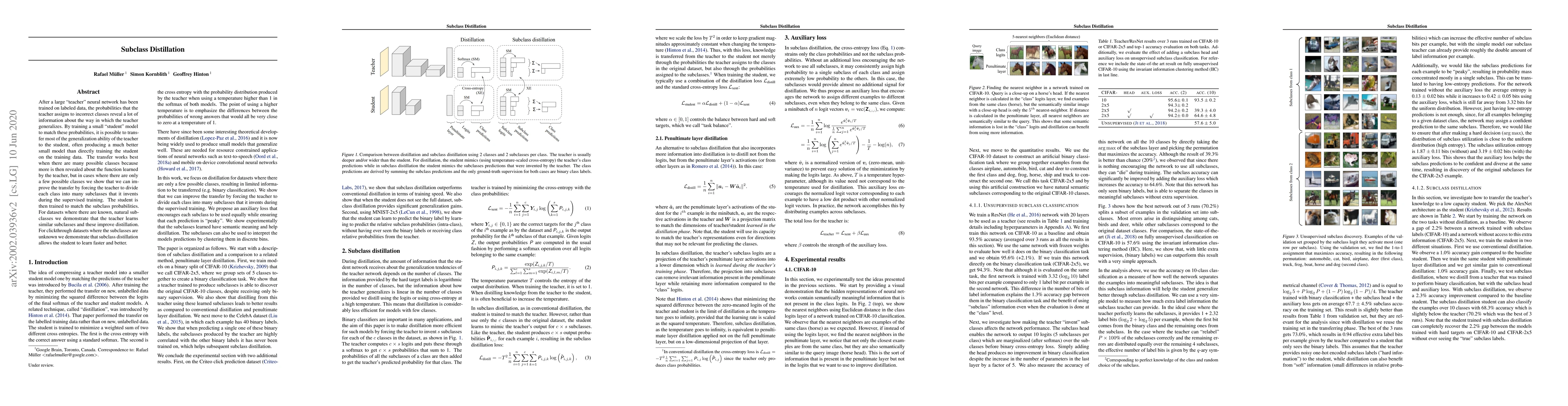 After a large "teacher" neural network has been trained on labeled data, the probabilities that the teacher assigns to incorrect classes reveal a lot of information about the way in which the teacher generalizes. By training a small "student" model to match these probabilities, it is possible to transfer most of the generalization ability of the teacher to the student, often producing a much better small model than directly training the student on the training data. The transfer works best when there are many possible classes because more is then revealed about the function learned by the teacher, but in cases where there are only a few possible classes we show that we can improve the transfer by forcing the teacher to divide each class into many subclasses that it invents during the supervised training. The student is then trained to match the subclass probabilities. For datasets where there are known, natural subclasses we demonstrate that the teacher learns similar subclasses and these improve distillation. For clickthrough datasets where the subclasses are unknown we demonstrate that subclass distillation allows the student to learn faster and better.