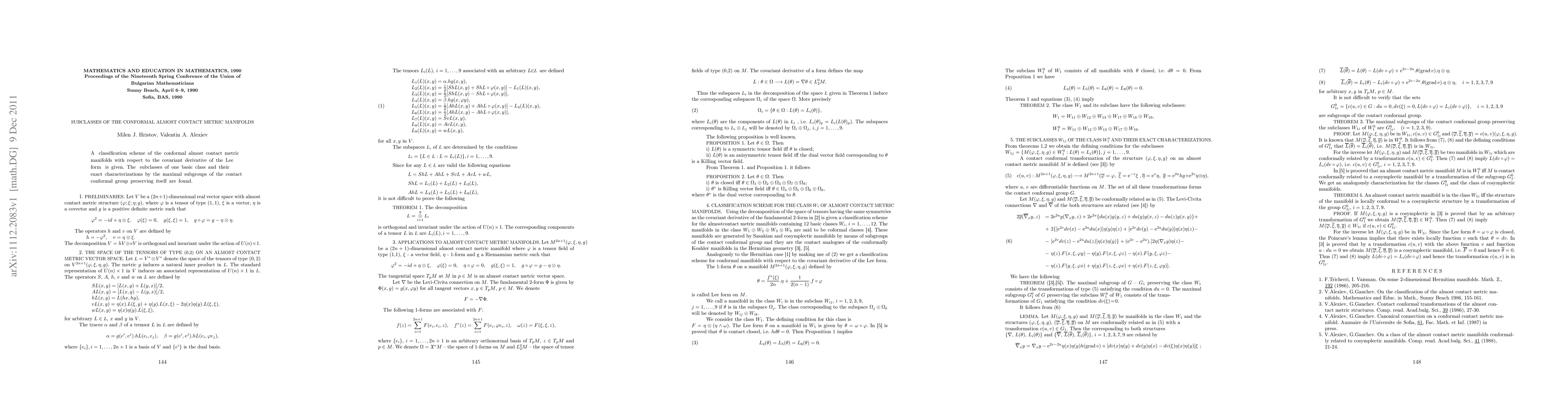 This paper classifies conformal almost contact metric manifolds based on the covariant derivative of the Lee form, identifying subclasses and characterizing them using maximal subgroups of the contact conformal group. The study provides a detailed framework for understanding these geometric structures.