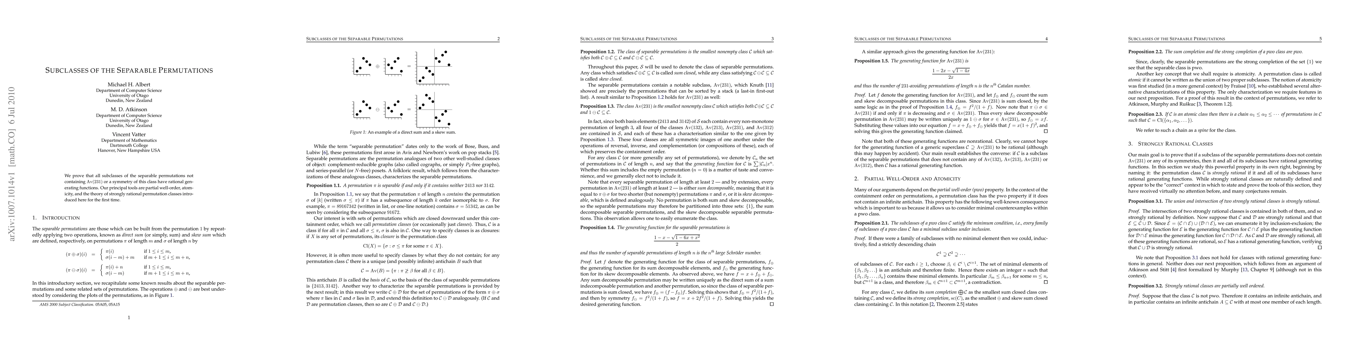 This paper demonstrates that subclasses of separable permutations excluding the permutation Av(231) or its symmetries possess rational generating functions, utilizing novel concepts like partial well-order, atomicity, and a newly introduced theory of strongly rational permutation classes.