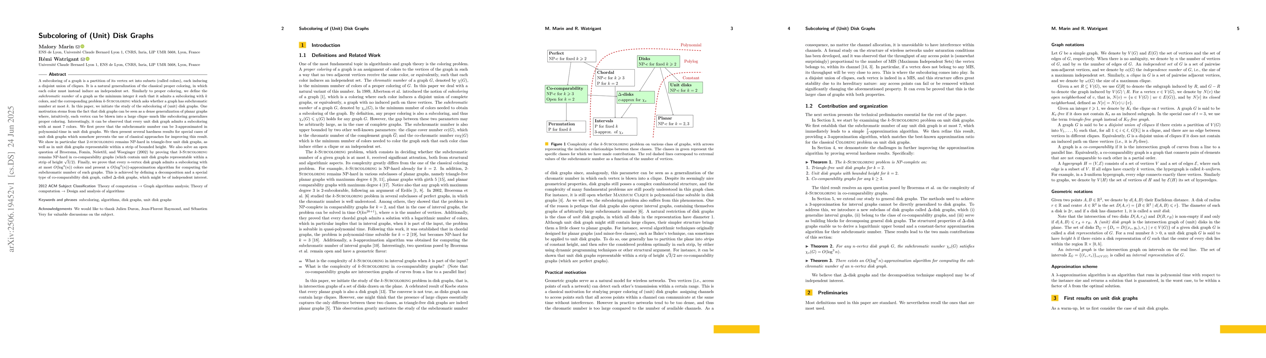 The paper studies subcoloring of (unit) disk graphs, a generalization of proper coloring where each color induces a disjoint union of cliques. It explores the subchromatic number, defined as the minimum number of colors needed for a subcoloring, and presents approximation algorithms and hardness results.