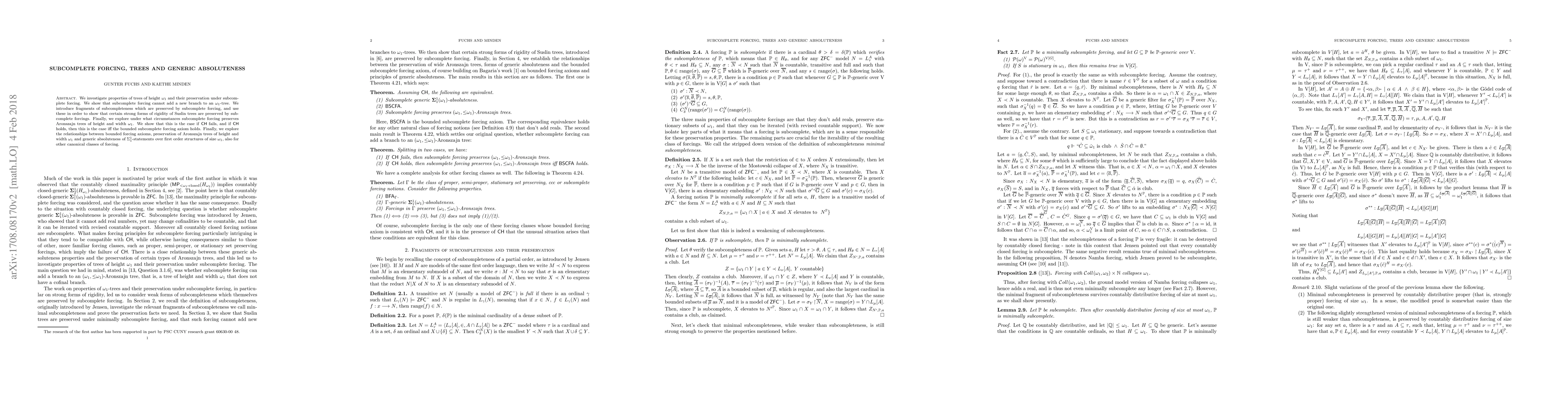 We investigate properties of trees of height $\omega_1$ and their preservation under subcomplete forcing. We show that subcomplete forcing cannot add a new branch to an $\omega_1$-tree. We introduce fragments of subcompleteness which are preserved by subcomplete forcing, and use these in order to show that certain strong forms of rigidity of Suslin trees are preserved by subcomplete forcings. Finally, we explore under what circumstances subcomplete forcing preserves Aronszajn trees of height and width $\omega_1$. We show that this is the case if CH fails, and if CH holds, then this is the case iff the bounded subcomplete forcing axiom holds. Finally, we explore the relationships between bounded forcing axioms, preservation of Aronszajn trees of height and width $\omega_1$ and generic absoluteness of $\Sigma^1_1$-statements over first order structures of size $\omega_1$, also for other canonical classes of forcing.
