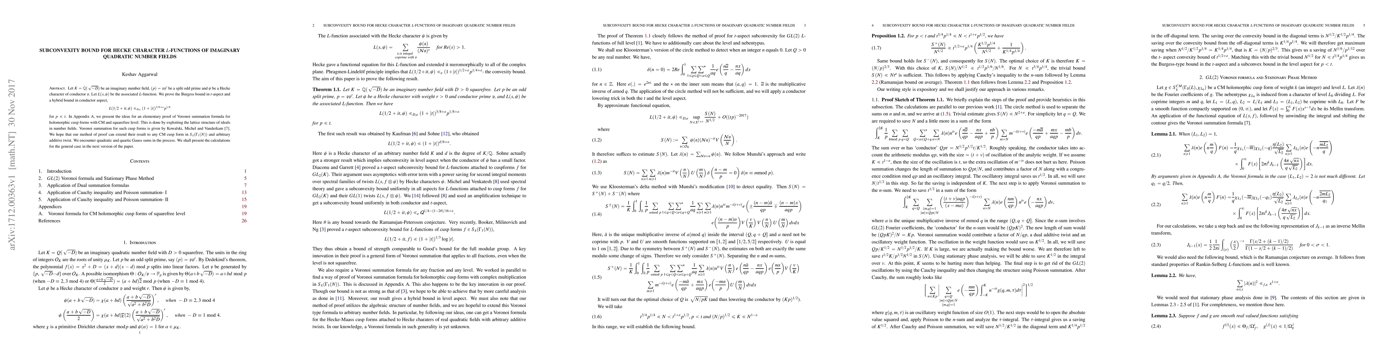 Let $K=\mathbb{Q}(\sqrt{-D})$ be an imaginary number field, $(p)=\mathfrak{p}\mathfrak{p}'$ be a split odd prime and $\psi$ be a Hecke character of conductor $\mathfrak{p}$. Let $L(s,\psi)$ be the associated $L$-function. We prove the Burgess bound in $t$-aspect and a hybrid bound in conductor aspect, \begin{equation*} L(1/2+it,\psi)\ll_{D,\varepsilon} (1+|t|)^{3/8+\varepsilon}p^{1/8} \end{equation*} for $p\ll t$. In Appendix A, we present the ideas for an elementary proof of Voronoi summation formula for holomorphic cusp forms with CM and squarefree level. This is done by exploiting the lattice structure of ideals in number fields. Voronoi summation for such cusp forms is given by Kowalski, Michel and Vanderkam (2002). We hope that our method of proof can extend their Voronoi formula to any CM cusp form in $S_k(\Gamma_1(N))$ and arbitrary additive twist. We encounter quadratic and quartic Gauss sums in the process. We shall present the calculations for the general case in the next version of the paper.