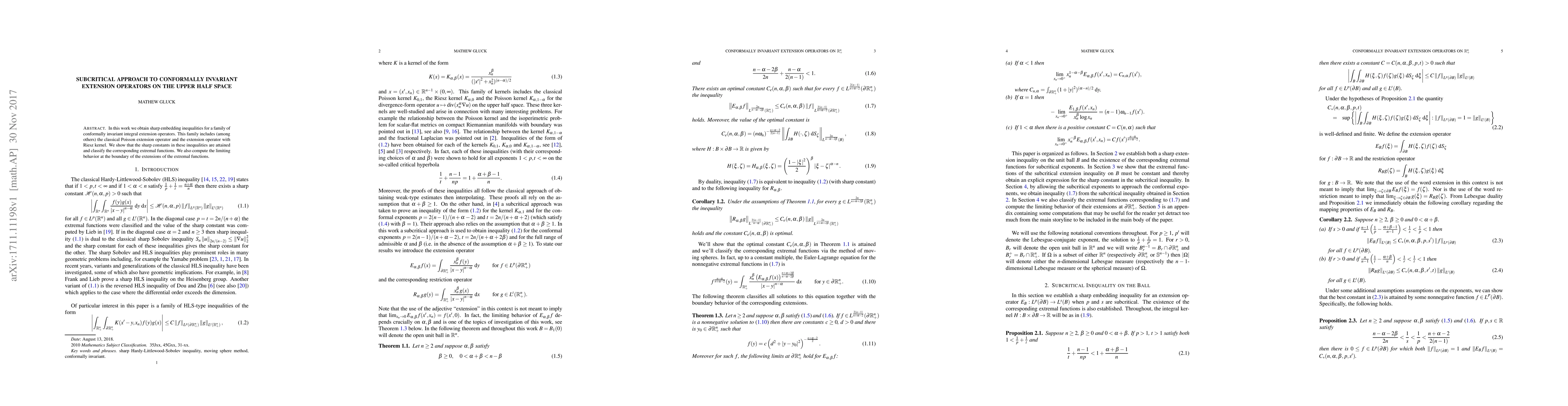 This paper establishes sharp embedding inequalities for conformally invariant integral extension operators, including the Poisson and Riesz kernel operators, and identifies the extremal functions that achieve these bounds, along with their boundary behavior.