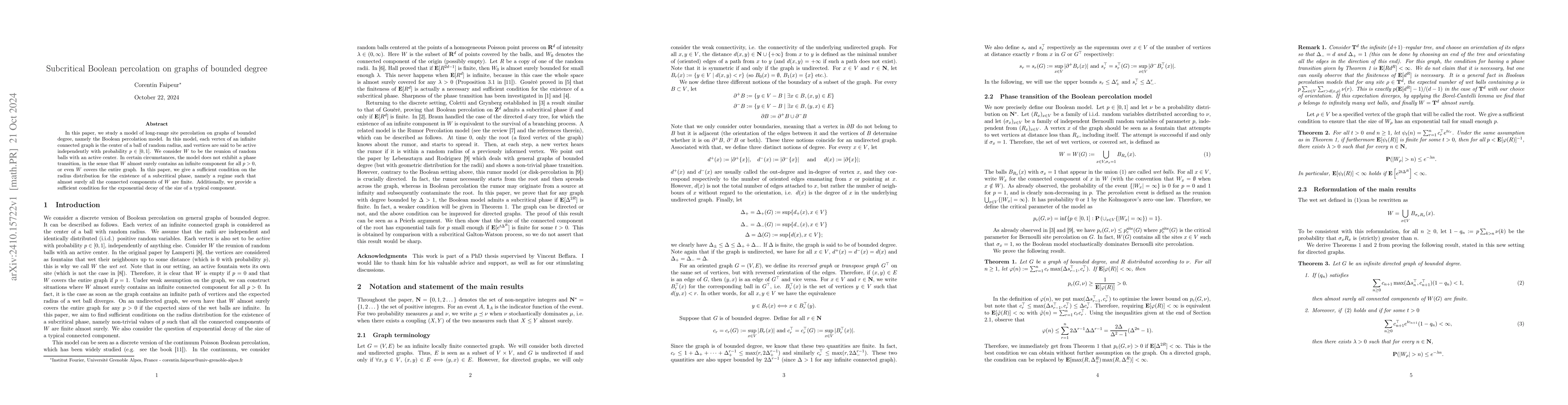 The research studies a Boolean percolation model on graphs of bounded degree, analyzing conditions for a subcritical phase where almost surely all connected components are finite.