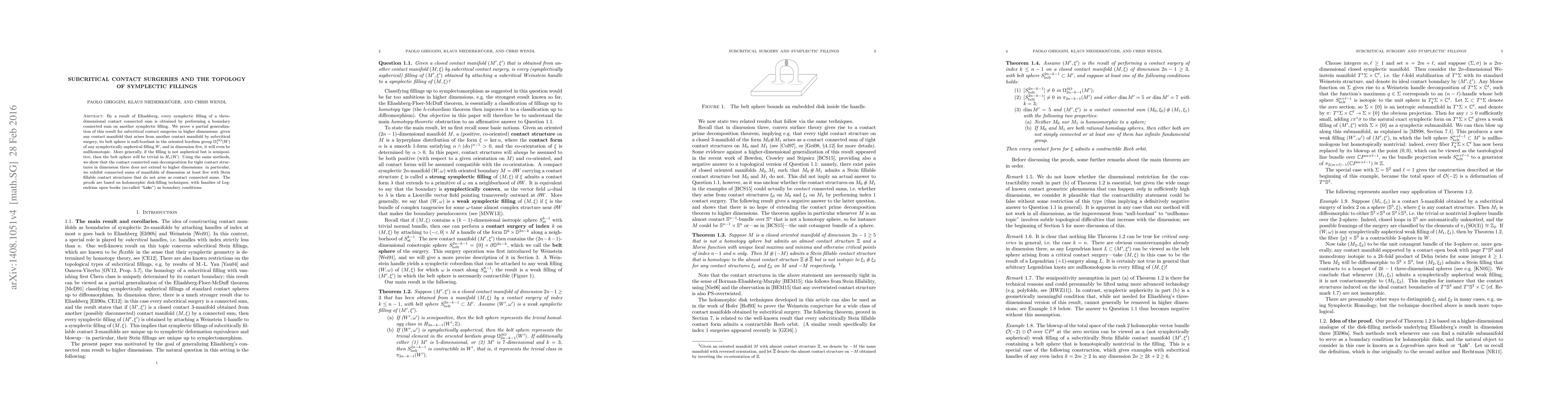 This paper generalizes Eliashberg's result on symplectic fillings by proving that the belt sphere of a contact manifold obtained via subcritical surgery is null-bordant in higher dimensions. It also shows that contact connected sum decomposition in dimension three does not extend to higher dimensions.
